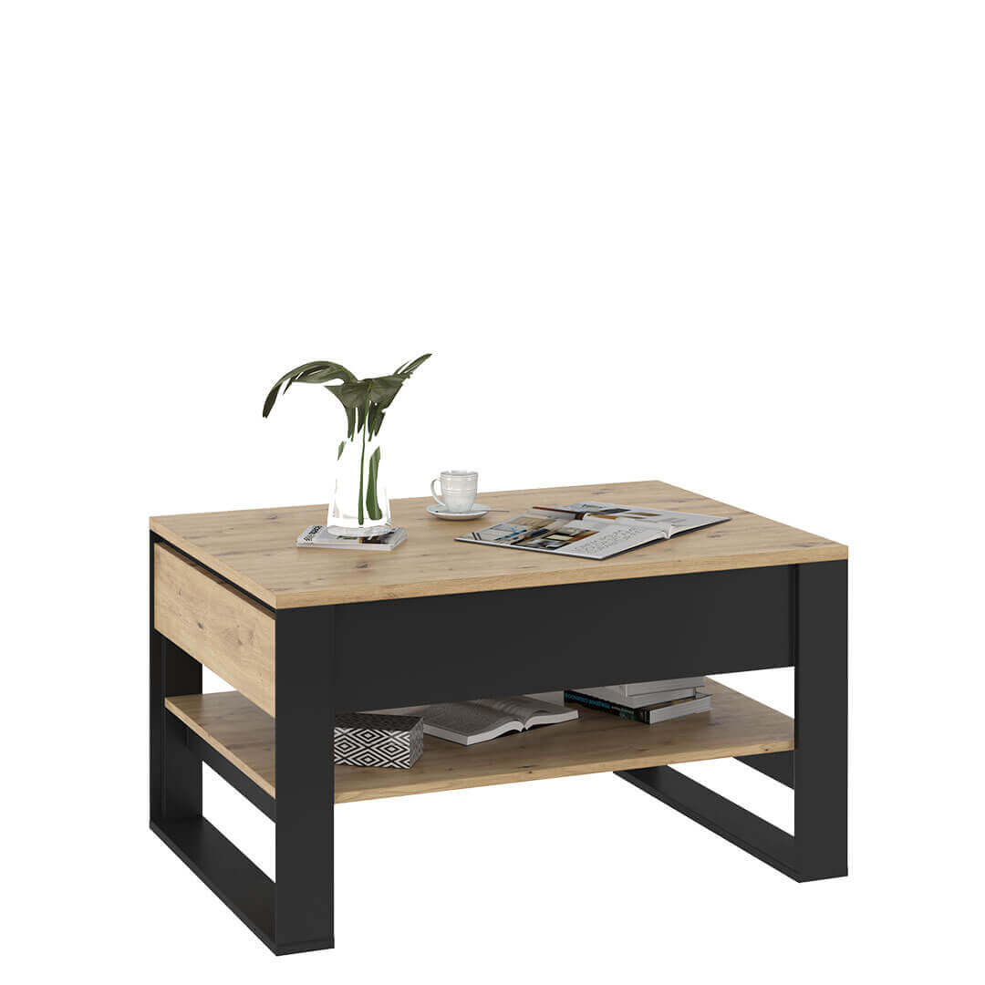 Design stolika kawowego QUANT zachwyci wielbicieli nowoczesnej elegancji. Połączenie dekoru z wyraźnym rysunkiem drewna oraz czarnych detali i smukłych nóżek dało nadzwyczaj stylowy efekt.