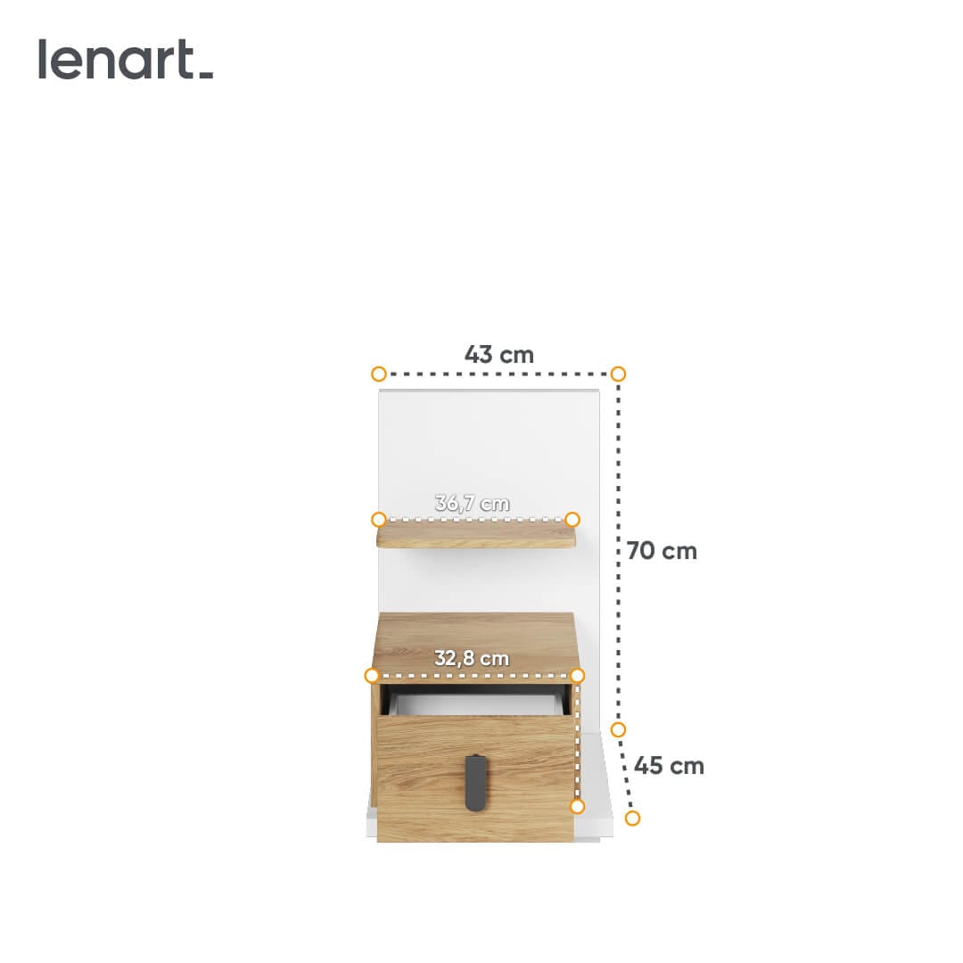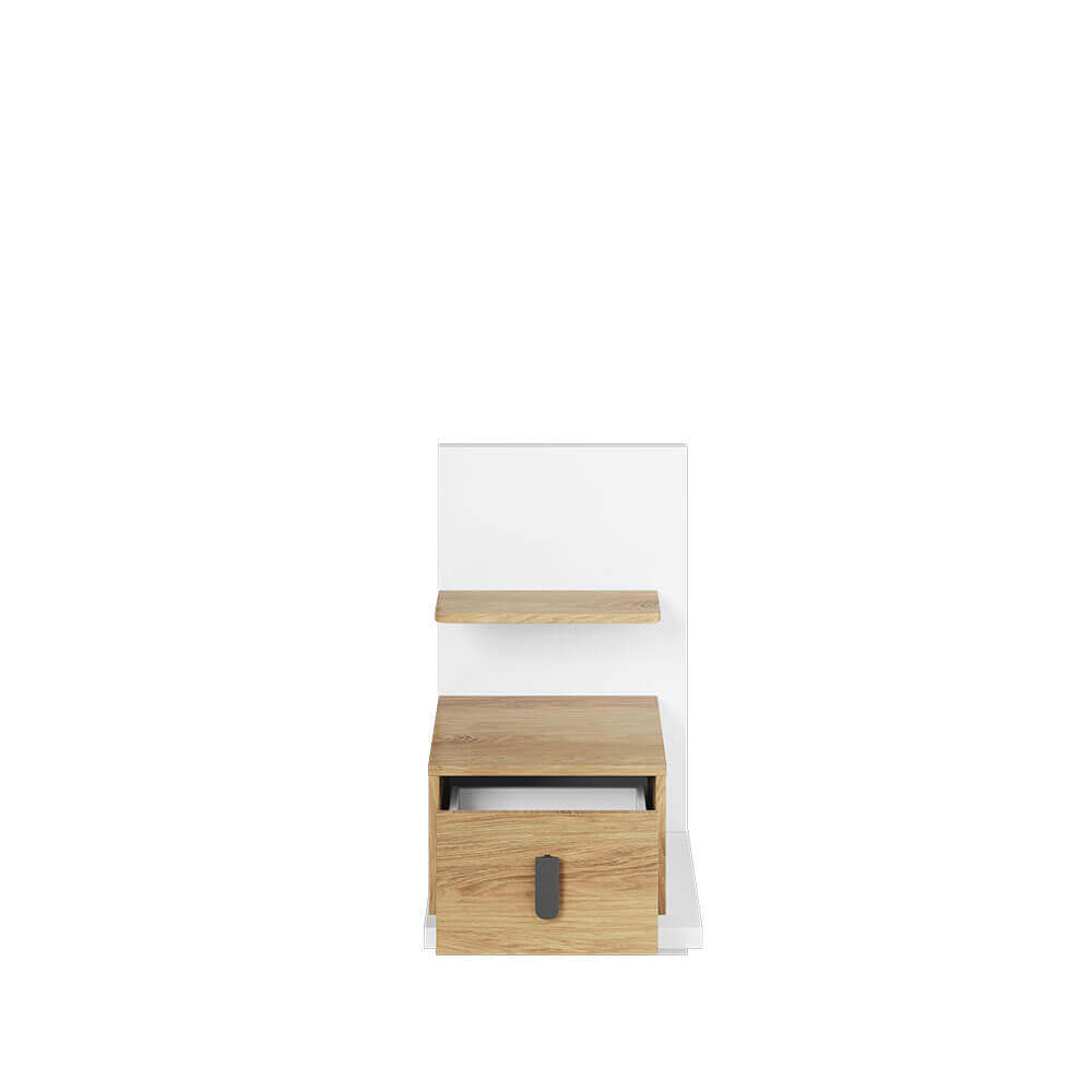 Elegancki stolik nocny o oryginalnym i nowoczesnym kształcie. Pojemna szuflada umożliwia łatwy dostęp do umieszczonych wewnątrz rzeczy. Blat szuflady oraz niewielka półka pozwalają wygodnie odłożyć najpotrzebniejsze przedmioty – telefon, budzik lub krem do rąk.