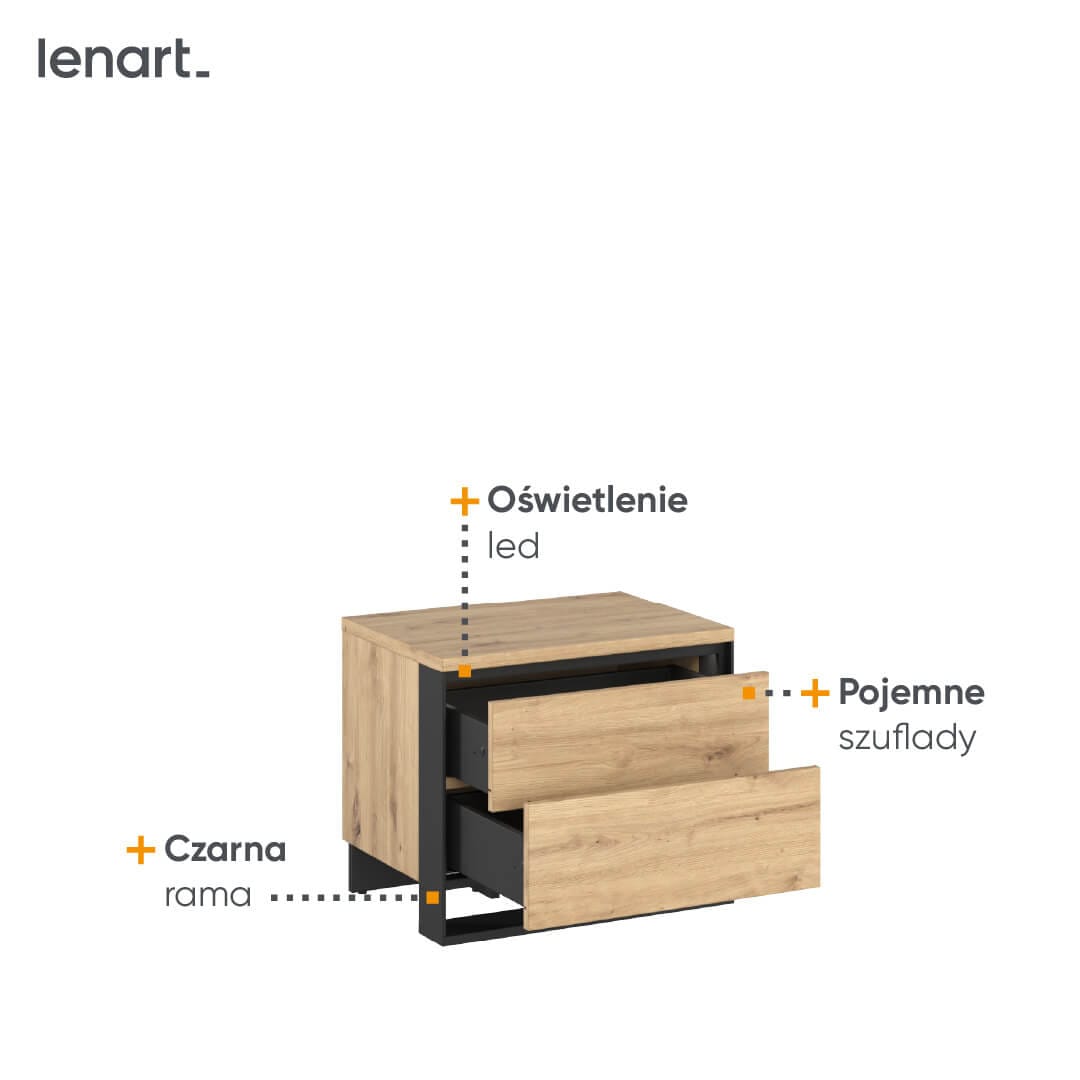 Za industrialny styl mebla odpowiada połączenie dekoru w kolorze drewna i czarnej ramy pełniącej rolę podpory. Ergonomicznej wysokości blat pozwala na wygodne usytuowanie budzika, telefonu, książki czy szklanki wody. W komplecie jest oświetlenie ledowe, które zapewni klimatyczny nastrój i umili chwile podczas wieczornego czytania książki.