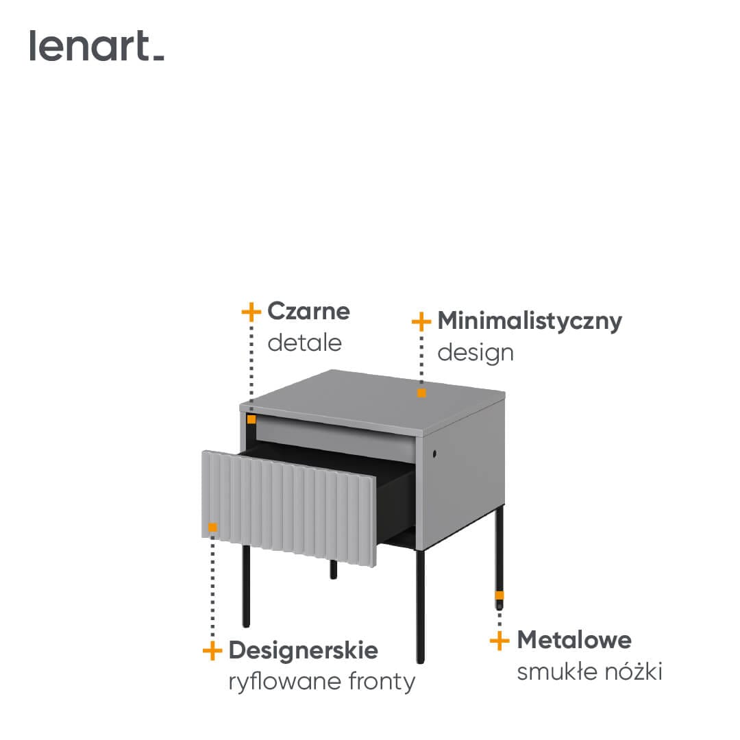 Stolik nocny szary to niezwykle praktyczny mebel, który znajduje swoje miejsce obok łóżka. Ten z kolekcji TREND jest nie tylko stylowy, ale również funkcjonalny. Ten designerski mebel ma ryflowany front, który dodaje mu charakteru i unikatowego wyglądu. Ryflowanie to szczególny detal, który nadaje meblowi elegancji i subtelności. Praktyczność stolika nocnego jest nieoceniona. Na jego blacie możesz trzymać lampkę nocną, budzik, książkę, szklankę wody czy telefon. Stolik nocny szary doskonale komponuje się z różnymi stylami wnętrz. Sprawdzi się zarówno w nowoczesnych, minimalistycznych aranżacjach, jak i w bardziej klasycznych czy rustykalnych sypialniach. Jego neutralny kolor doda subtelności i harmonii do przestrzeni, a jednocześnie nie zdominuje innych elementów wystroju.
