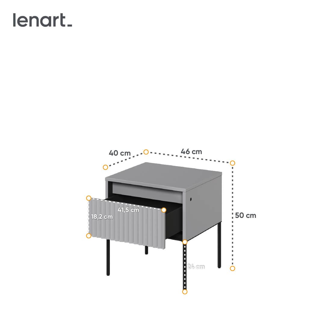 Wybierając nasz szary stolik nocny, zyskujesz nie tylko praktyczny mebel, ale również estetyczny element, który wzbogaci Twoją sypialnię. Jego solidna konstrukcja i wytrzymałe materiały gwarantują długotrwałe użytkowanie bez obaw o uszkodzenia. Nie czekaj dłużej i dodaj do swojej sypialni szary stolik nocny z ryflowanymi frontami. Ciesz się jego praktycznością i pięknym wyglądem, który podkreśli charakter Twojego wnętrza.