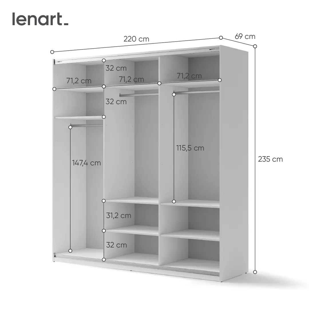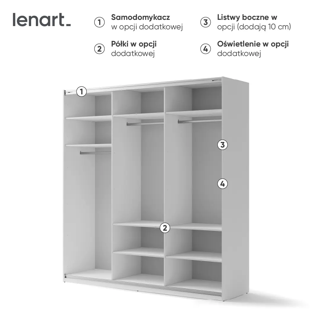 Szafę 220 cm możesz dodatkowo wyposażyć w: samodomykacz do drzwi przesuwnych, półki dzięki którym z łatwością dostosujesz wnętrze szafy do swoich potrzeb, a także w opaskę z oświetleniem ledowym, która z zależności od wolnego miejsca do zagospodarowania pozwoli Ci dopasować szerokość szafy.
