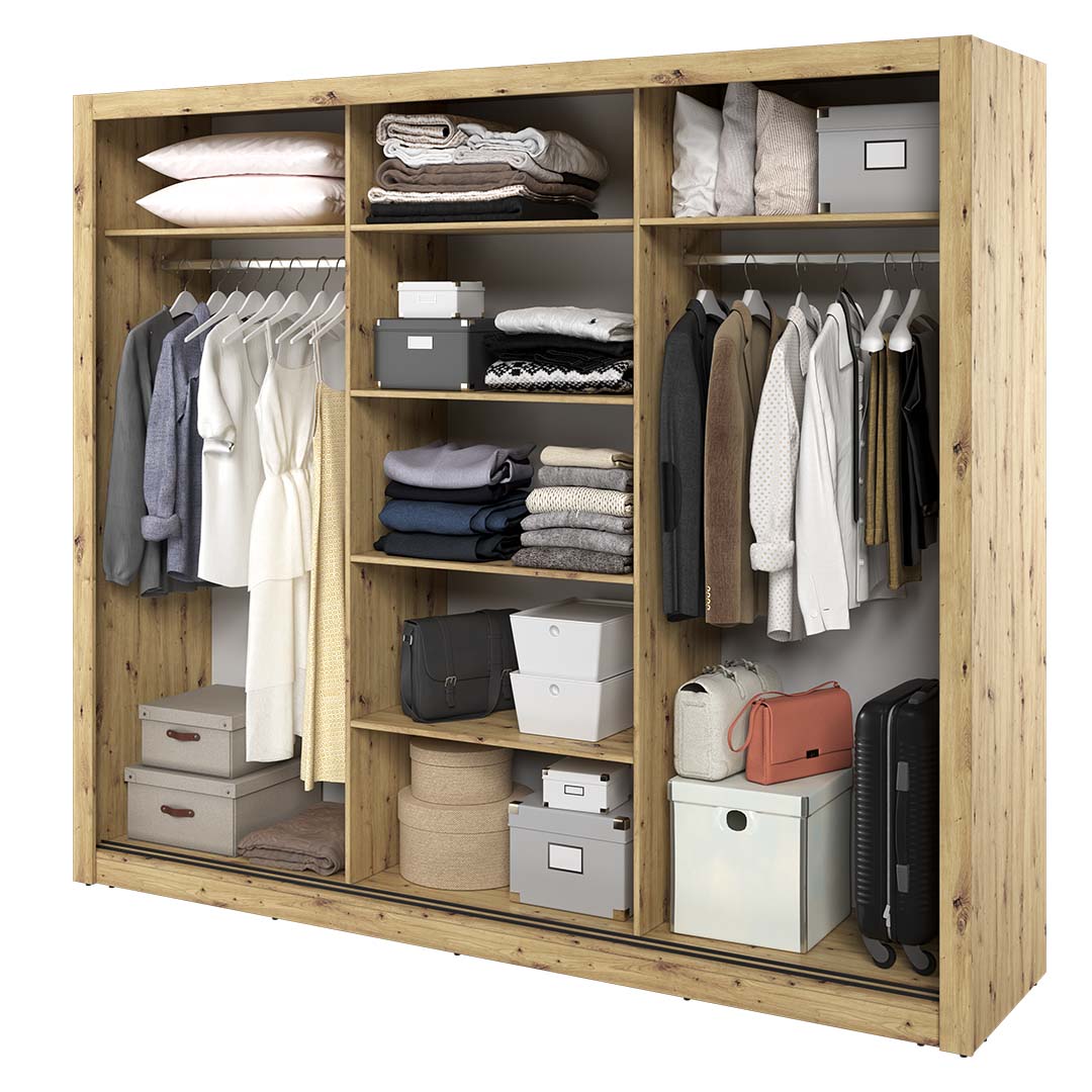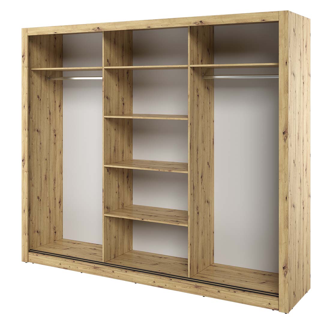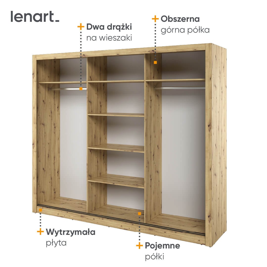Szafa 3-drzwiowa z lustrem to synonim doskonałego designu i praktycznego podejścia do organizacji przestrzeni. Przesuwne, lustrzane fronty zapewniają łatwy dostęp do Twoich ubrań. Teraz przygotowanie się do wyjścia stanie się przyjemnością! Nie tylko praktyczna, nasza szafa 3-drzwiowa z lustrem wyróżnia się także estetyką i solidnością wykonania. Zaprojektowana z myślą o nowoczesnych wnętrzach, dostępna jest w różnorodnych wariantach kolorystycznych, abyś mógł swobodnie dostosować ją do swojego stylu. Rozmieszczenie półek wewnątrz szafy zostało starannie przemyślane, aby zapewnić optymalne warunki przechowywania dla różnorodnych elementów garderoby. Od koszul i sukienek po buty i dodatki – nasza szafa 3-drzwiowa z lustrem pomieści wszystko, zachowując jednocześnie porządek i estetykę.