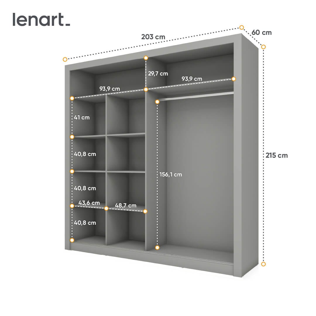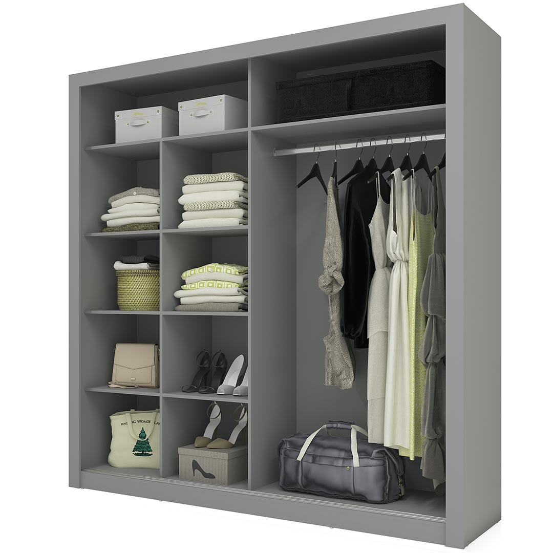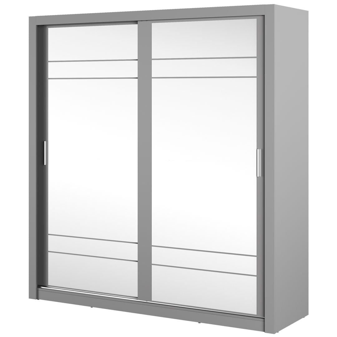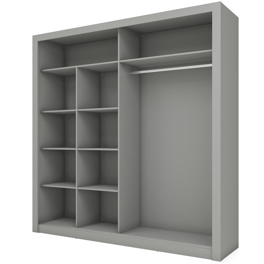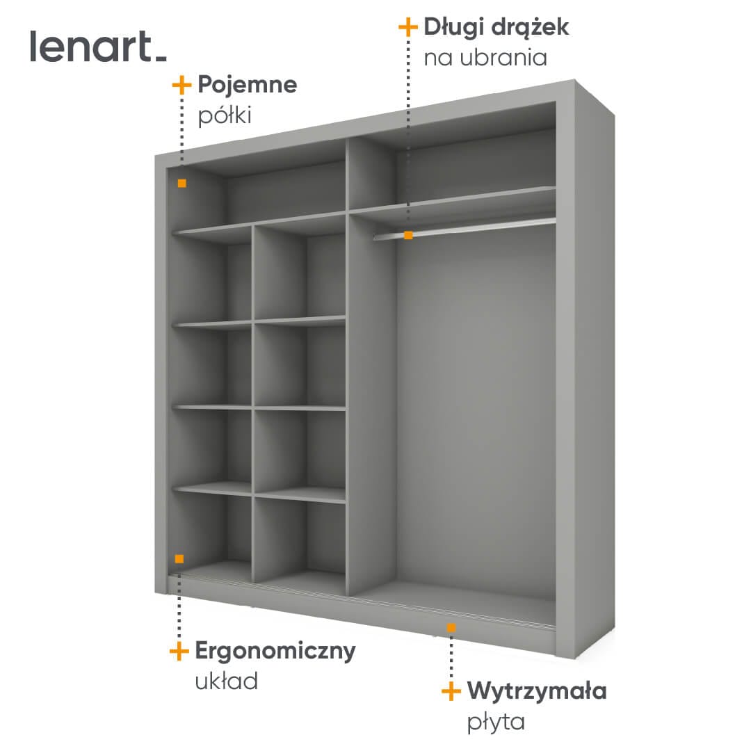 Pojemna szafa z dwojgiem drzwi przesuwnych i ergonomicznym układem wnętrza. Idealna do sypialni, garderoby lub przedpokoju. Na frontach znajduje się tafla luster, która optycznie powiększa wnętrze, wprowadza do pomieszczenia więcej światła oraz dobrze wpływa na komfort używania mebla.