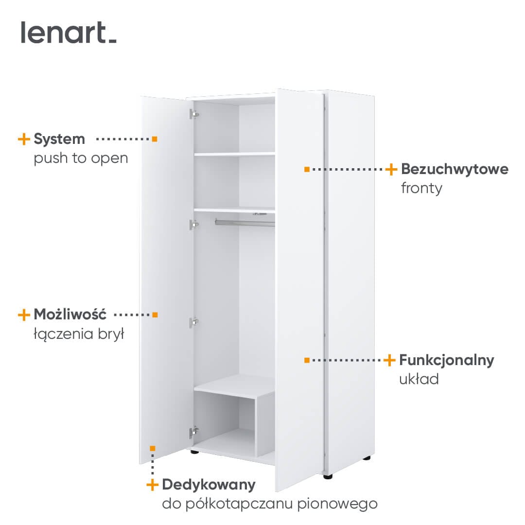 Jeśli potrzebujesz mebla, który ułatwi Ci utrzymanie porządku w garderobie oraz nada pomieszczeniu bardziej zorganizowanego wyglądu, to idealnie trafiłeś! Szafa dwudrzwiowa do półkotapczanu Bed Concept o orientacji pionowej wprowadzi ład wokół Twoich rzeczy codziennego użytku. Została wyposażona w praktyczne półki oraz drążek na wieszaki, na którym swobodnie zawiesisz odzież o różnej długości. Jeśli cenisz sobie nowoczesny i oryginalny design mebli, to ta szafa jest dla Ciebie stworzona! Jej designerski wygląd zawdzięczamy modnej kolorystyce, niebanalnej formie oraz bezuchwytowym frontom, które nadają jej wyjątkowego charakteru.