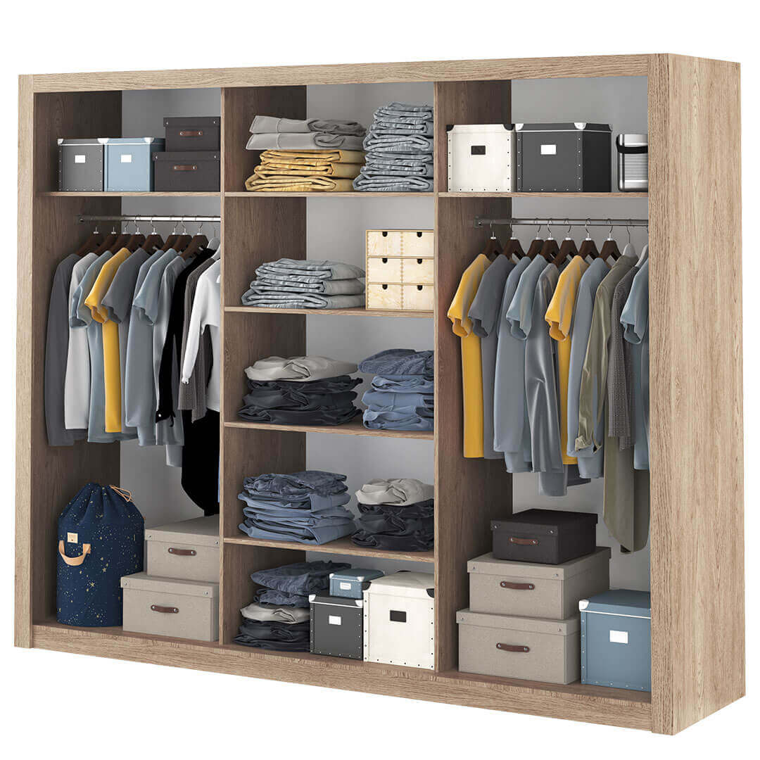 Wnętrze szafy kryje dwa drążki na wieszaki oraz wewnętrzy regał z pojemnymi półkami. Na obszernych, górnych półkach z powodzeniem zmieszczą się rzadziej używane rzeczy lub walizki. Symetryczny układ mebla pozwala sprawiedliwie podzielić się miejscem z partnerem lub partnerką.
