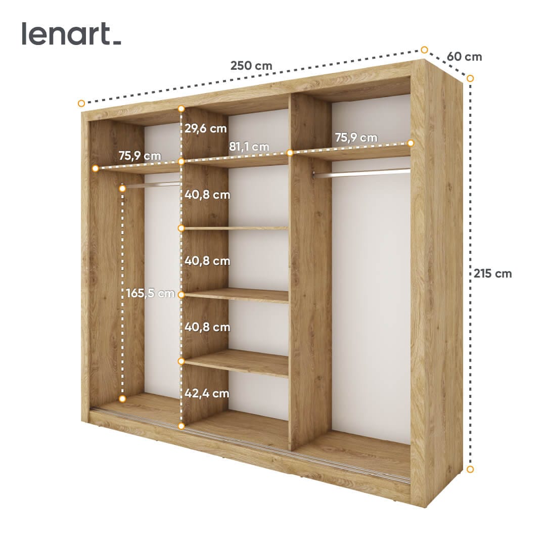 Bardzo pojemna, nowoczesna szafa z trojgiem drzwi przesuwnych, które świetnie oszczędzają przestrzeń. Idealna do sypialni, garderoby lub przedpokoju.
