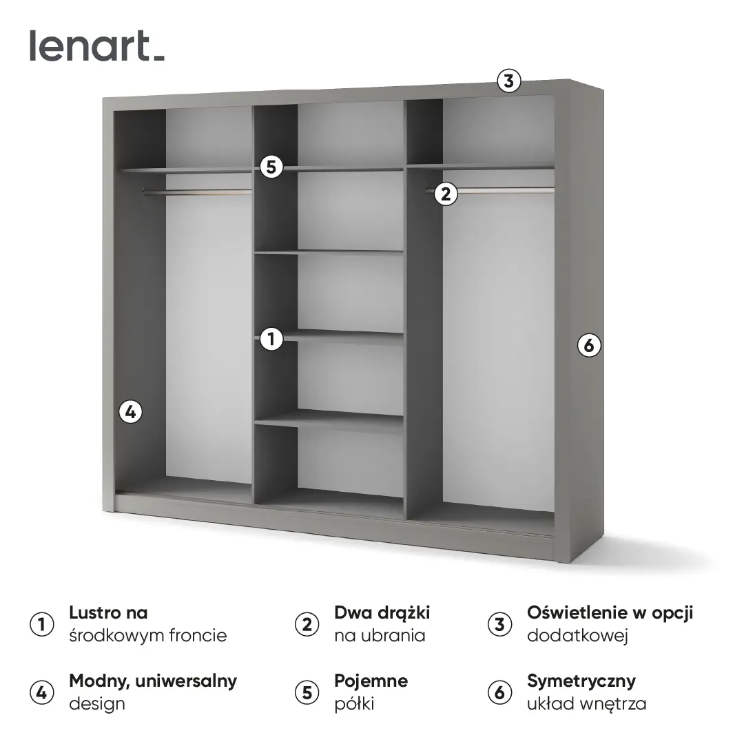 Modny, a jednocześnie uniwersalny design to zasługa prostej formy oraz sprawdzonych wybarwień, w jakich dostępna jest szafa. Uzupełnieniem jest lustro, zastosowane na środkowym froncie, które optycznie powiększa przestrzeń i pozytywnie wpływa na komfort korzystania z szafy.