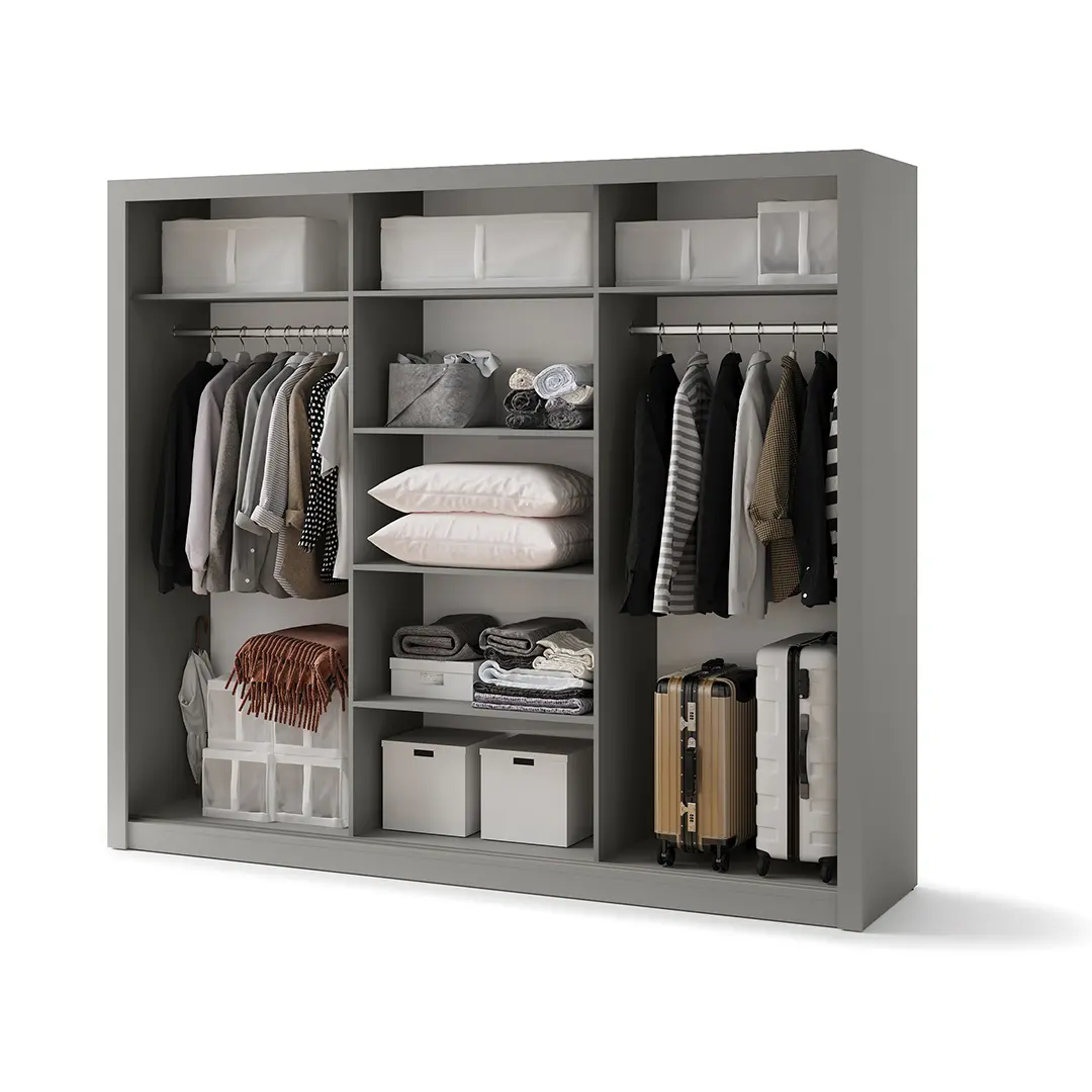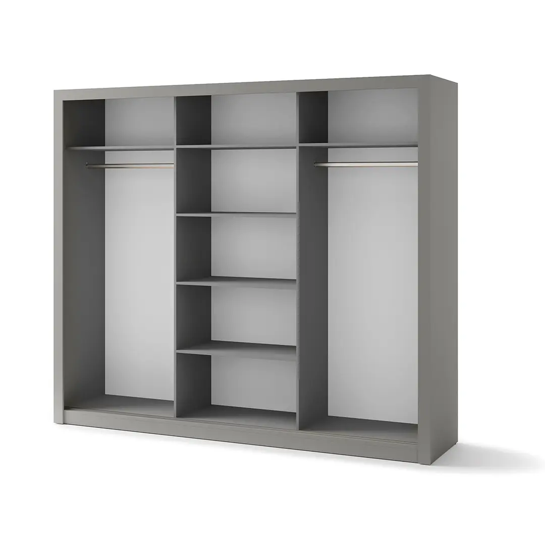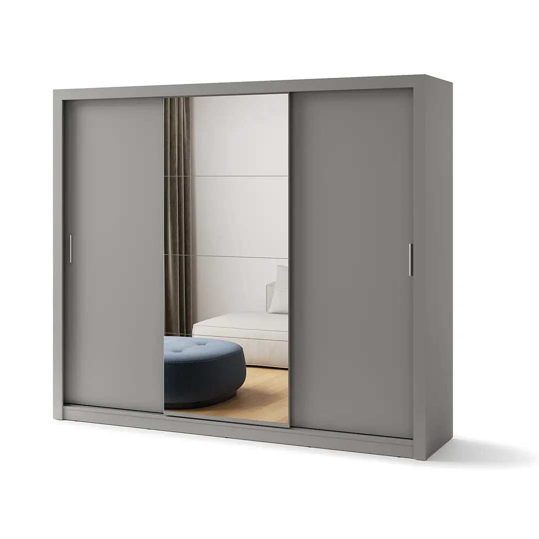 Bardzo pojemna, nowoczesna szafa z trojgiem drzwi przesuwnych, które świetnie oszczędzają przestrzeń. Idealna do sypialni, garderoby lub przedpokoju.