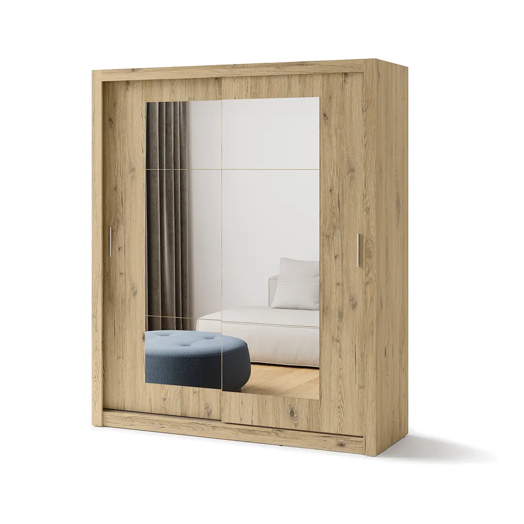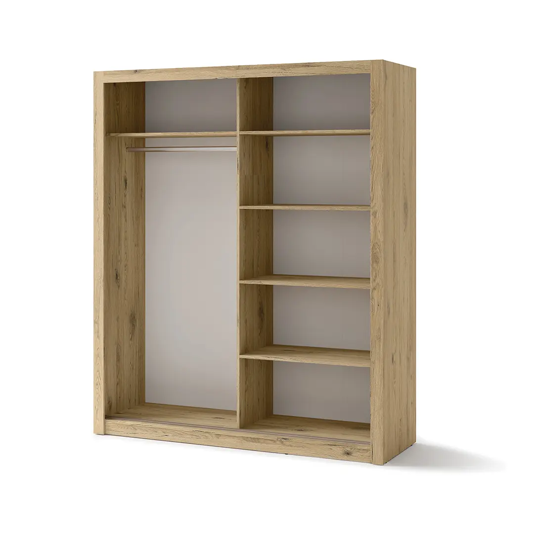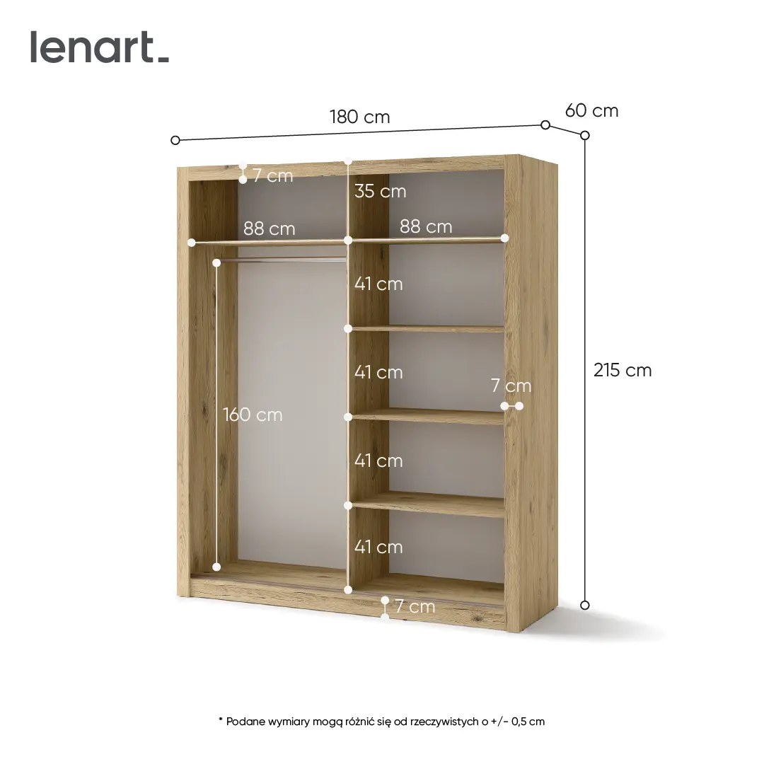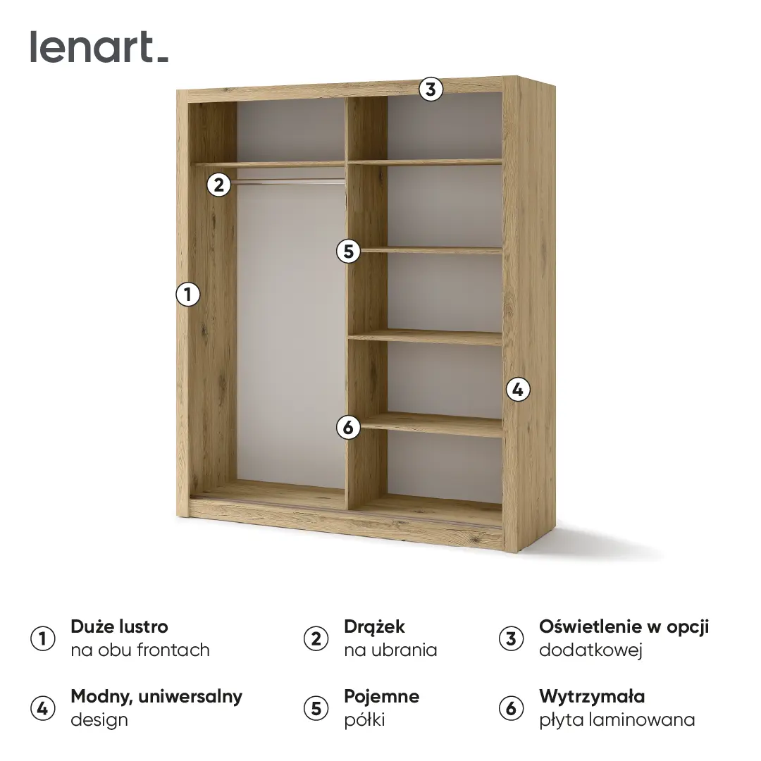 Bardzo pojemna, nowoczesna szafa z dwojgiem drzwi przesuwnych, które świetnie oszczędzają przestrzeń. Idealna do sypialni, garderoby, przedpokoju lub pokoju nastolatki/nastolatka.