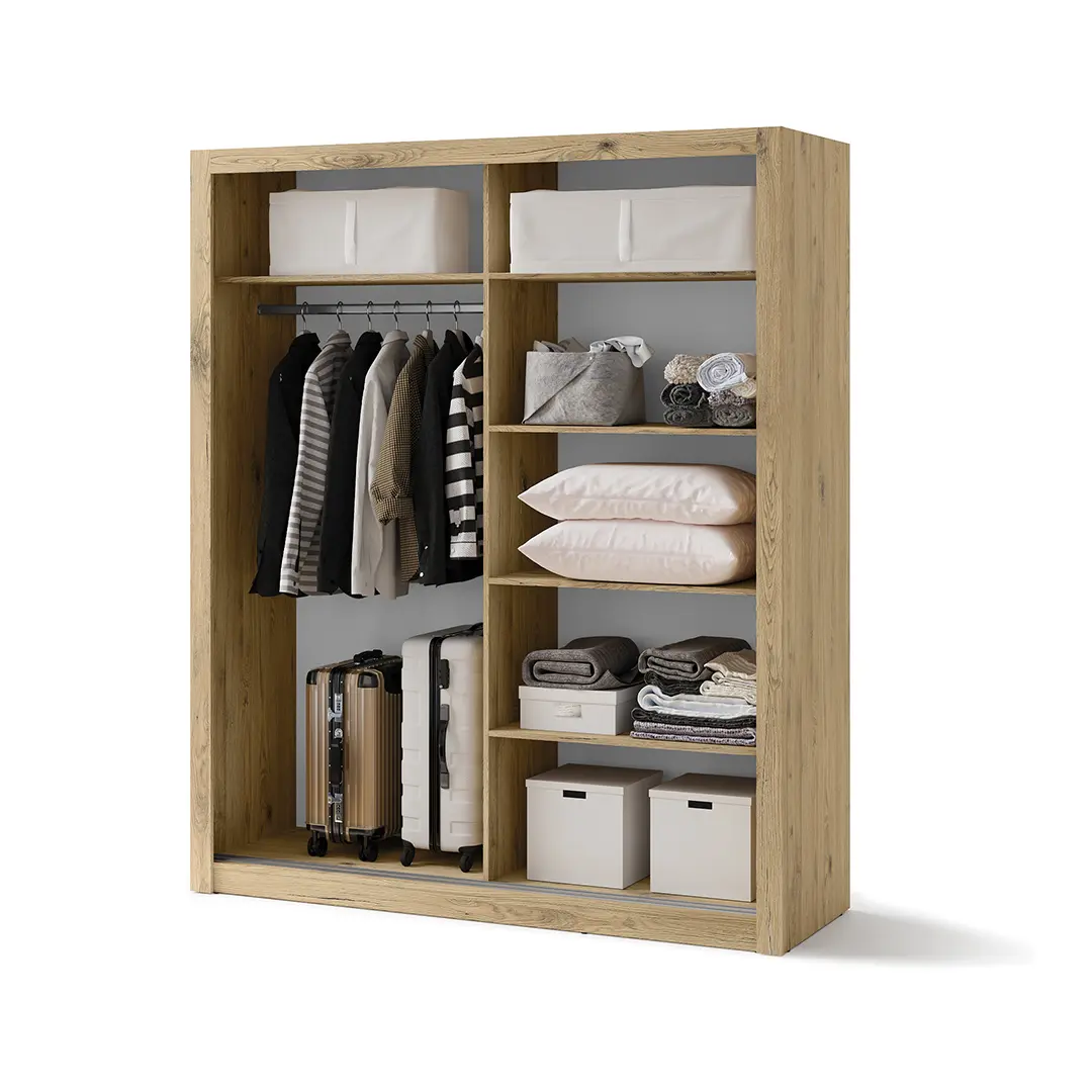 Bardzo pojemna, nowoczesna szafa z dwojgiem drzwi przesuwnych, które świetnie oszczędzają przestrzeń. Idealna do sypialni, garderoby, przedpokoju lub pokoju nastolatki/nastolatka.
