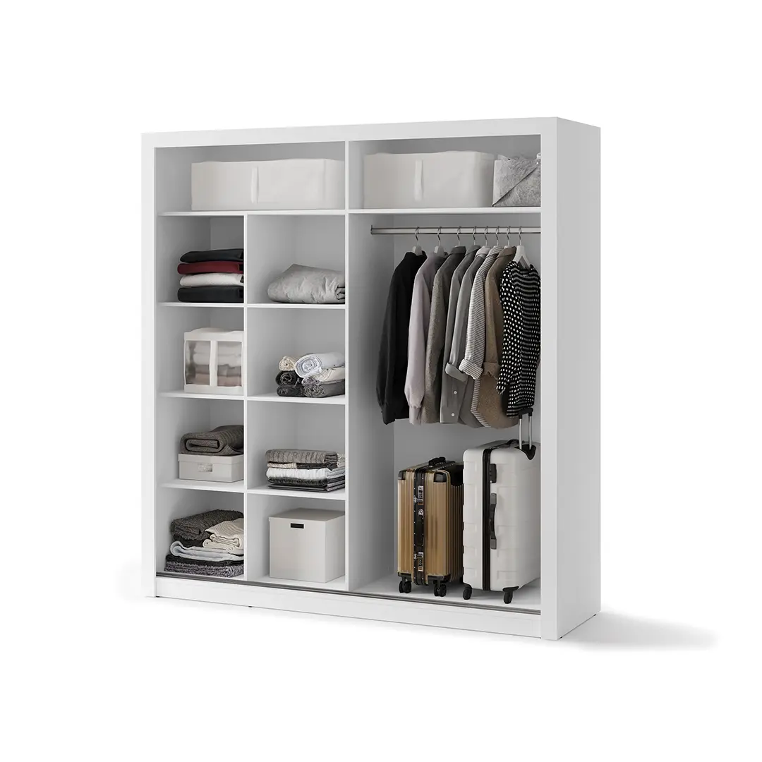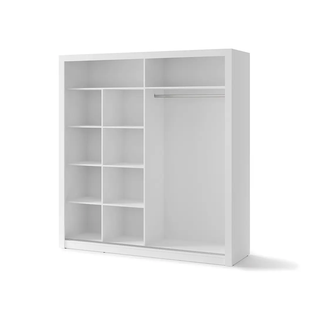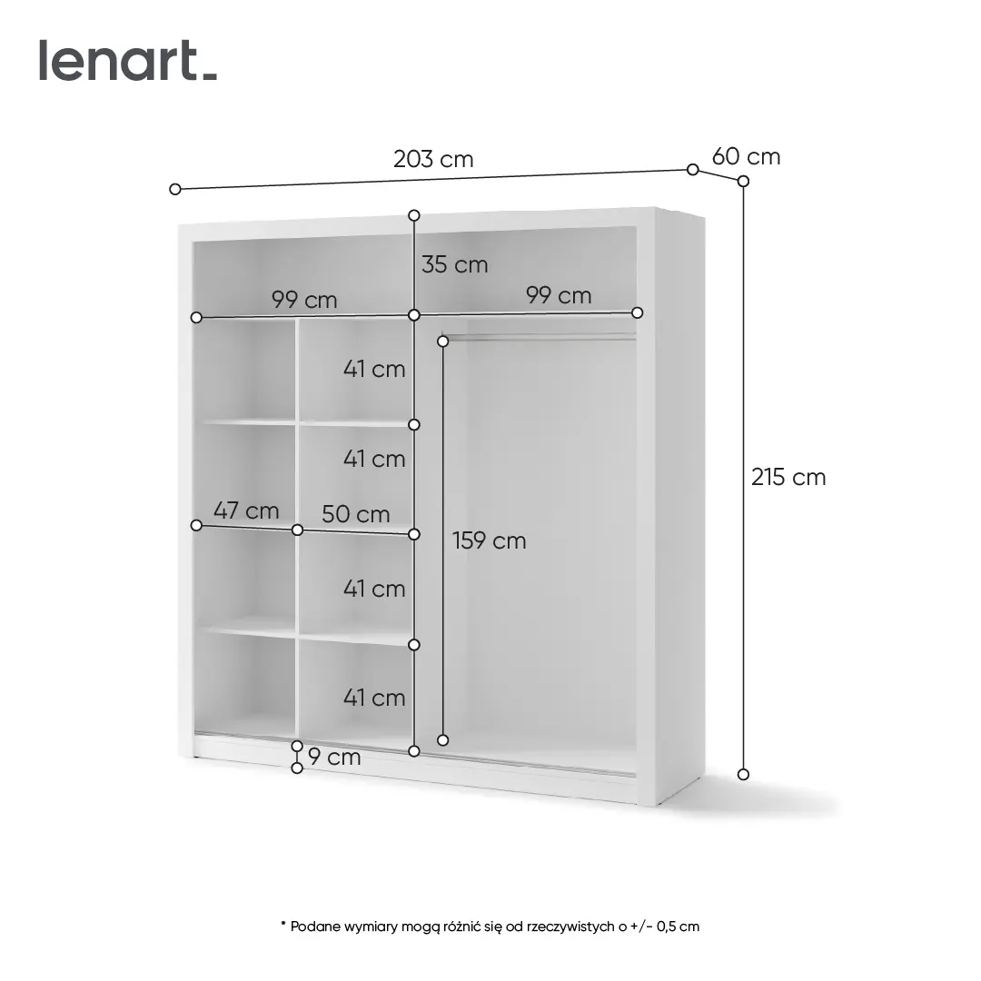 Wnętrze szafy kryje przyjazny i funkcjonalny układ – znajdziesz tam drążek na wieszaki oraz dwa wewnętrzne regały z półkami. Dostępne są również dwie wewnętrzne szuflady – idealne do przechowywania bielizny.