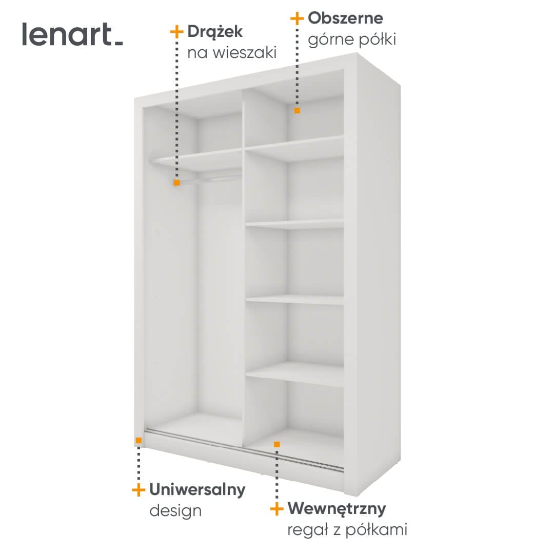 Modny, a jednocześnie uniwersalny design to zasługa prostej formy oraz sprawdzonych wybarwień, w jakich dostępna jest szafa. Uzupełnieniem jest duże lustro na obu frontach, które optycznie powiększa przestrzeń i pozytywnie wpływa na komfort korzystania z szafy.