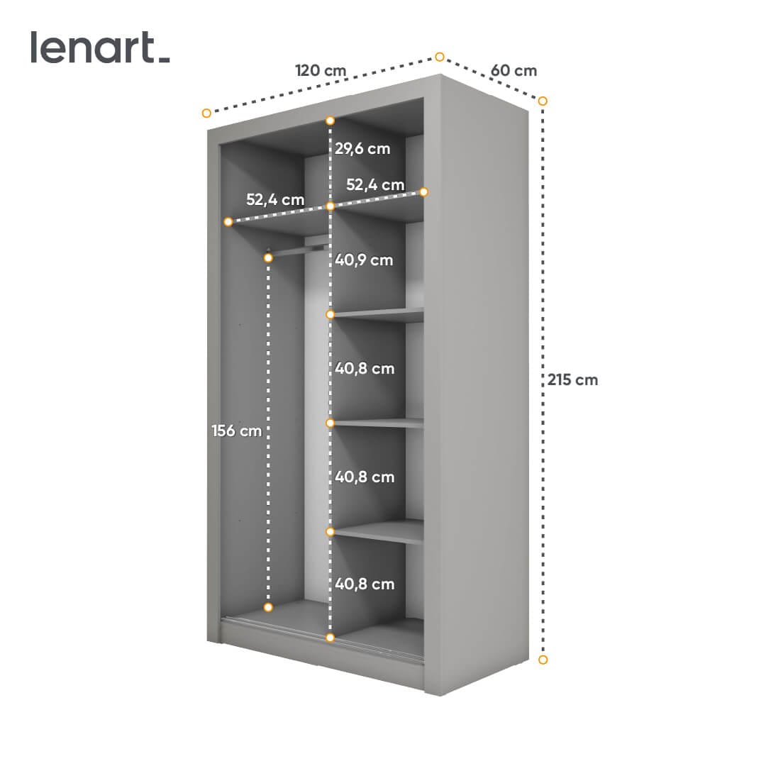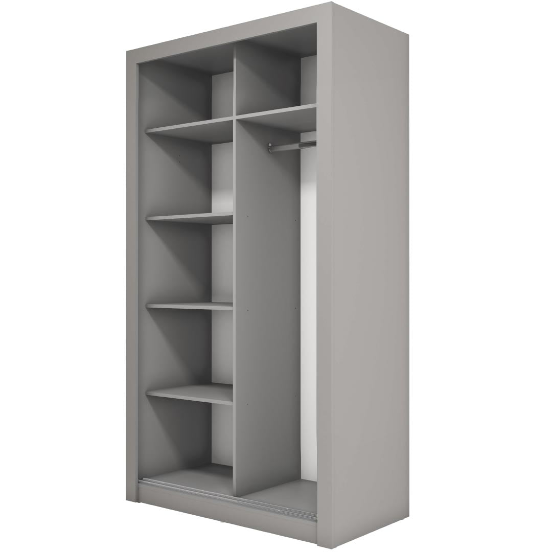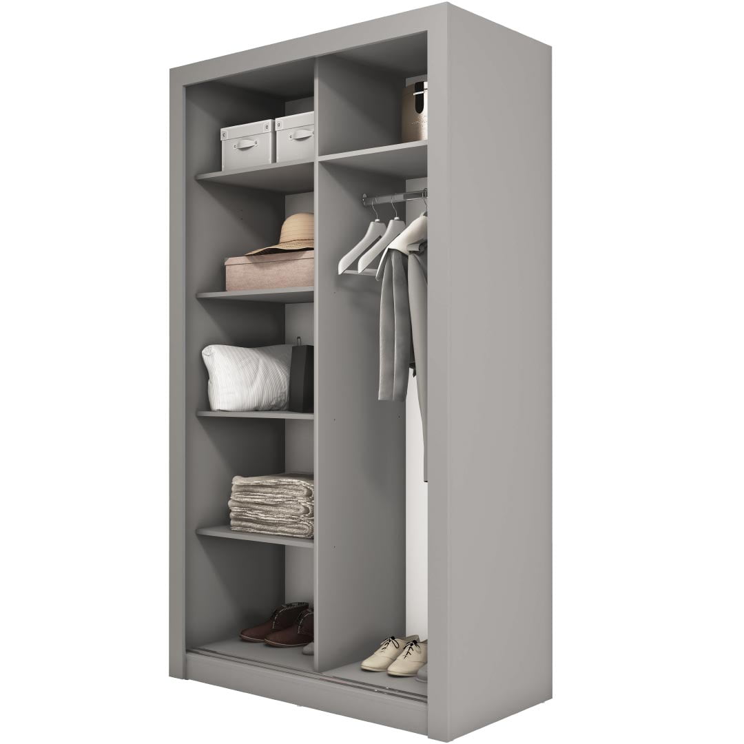 Niewielka szafa z dwojgiem drzwi przesuwnych, które świetnie oszczędzają przestrzeń. Idealna do sypialni, garderoby, przedpokoju lub pokoju nastolatki/nastolatka.