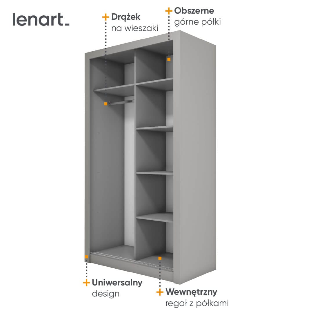 Modny, a jednocześnie uniwersalny design to zasługa prostej formy oraz sprawdzonych wybarwień, w jakich dostępna jest szafa. Uzupełnieniem jest duże lustro na obu frontach, które optycznie powiększa przestrzeń i pozytywnie wpływa na komfort korzystania z szafy.