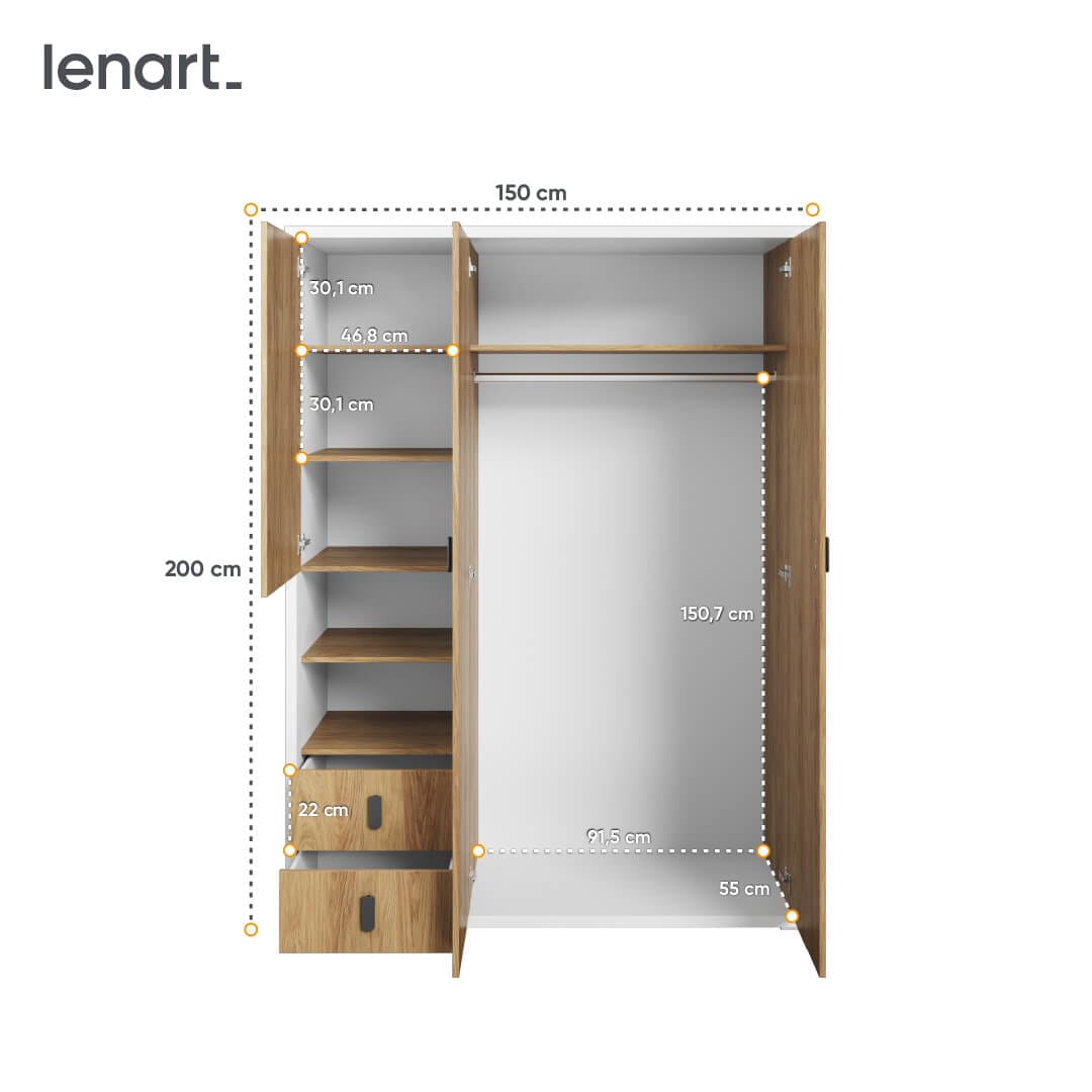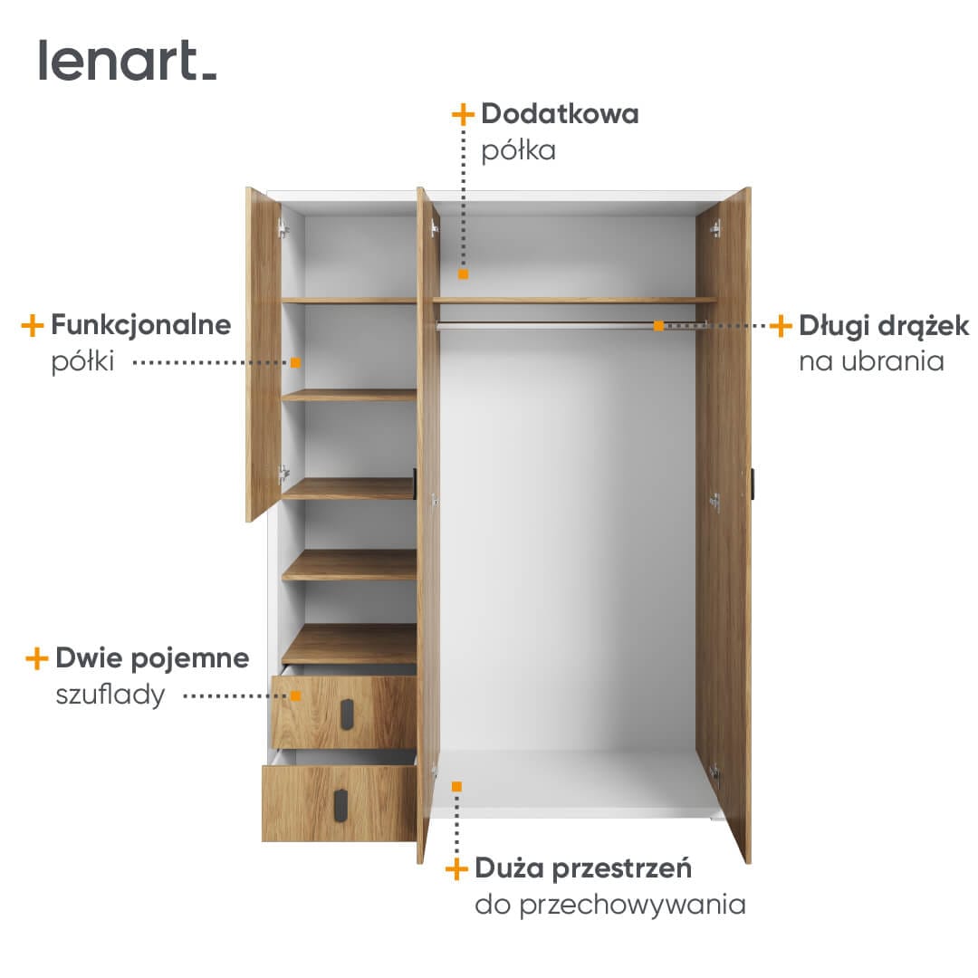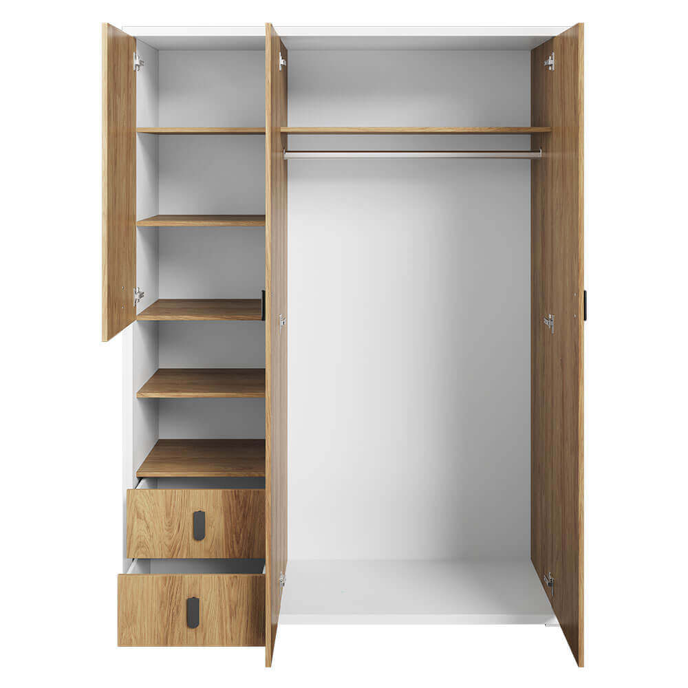 Duża i pojemna szafa o oryginalnym układzie wnętrza. Znajdziesz w niej długi drążek na odzież, na którym swobodne zawiesisz ubrania o różnej długości. Dodatkowe miejsce do przechowywania stworzono na półce nad drążkiem oraz na dnie szafy. Mebel wyposażono również w dwie szuflady, zamykaną szafkę z trzema wewnętrznymi półkami oraz dwie otwarte półki na książki lub dekoracje.