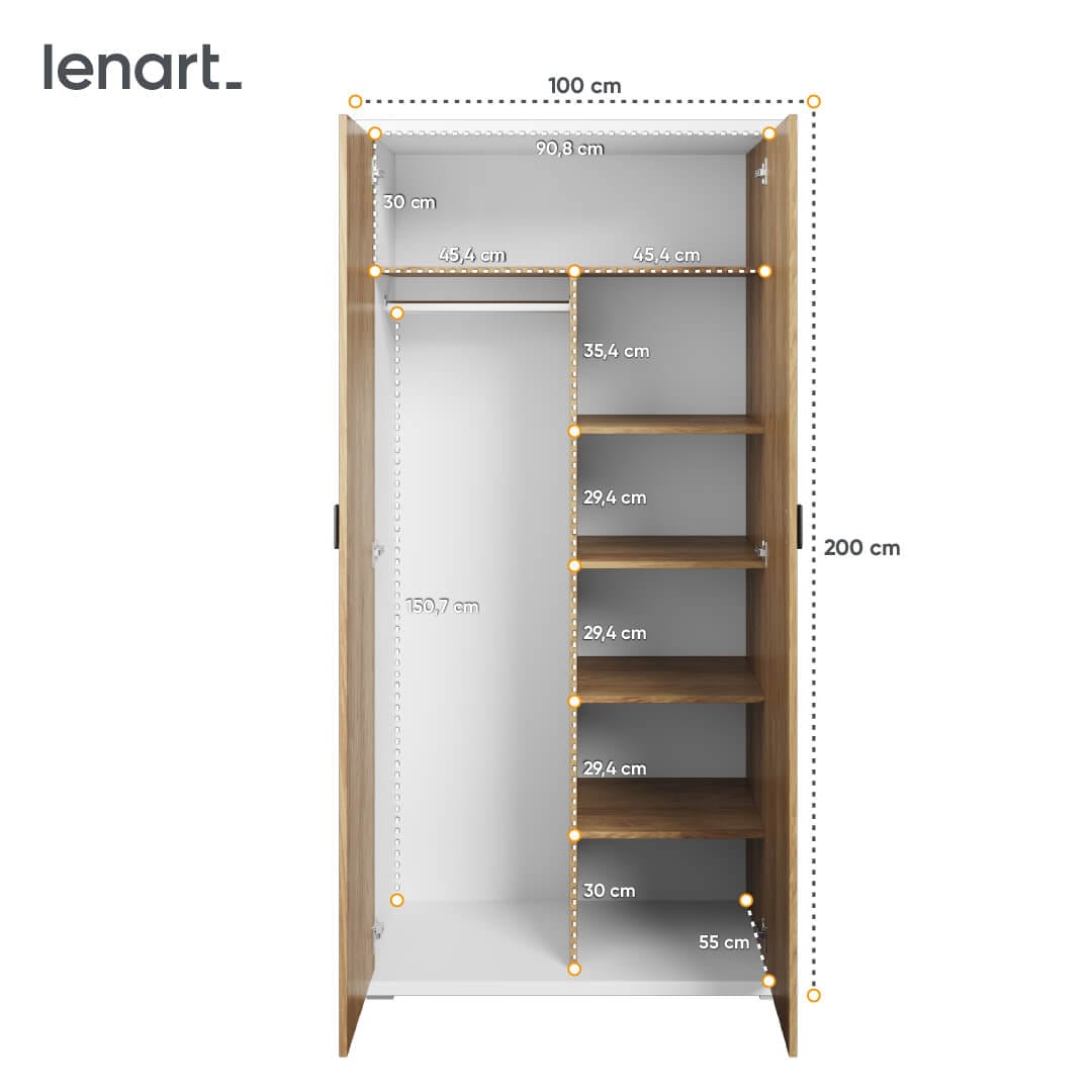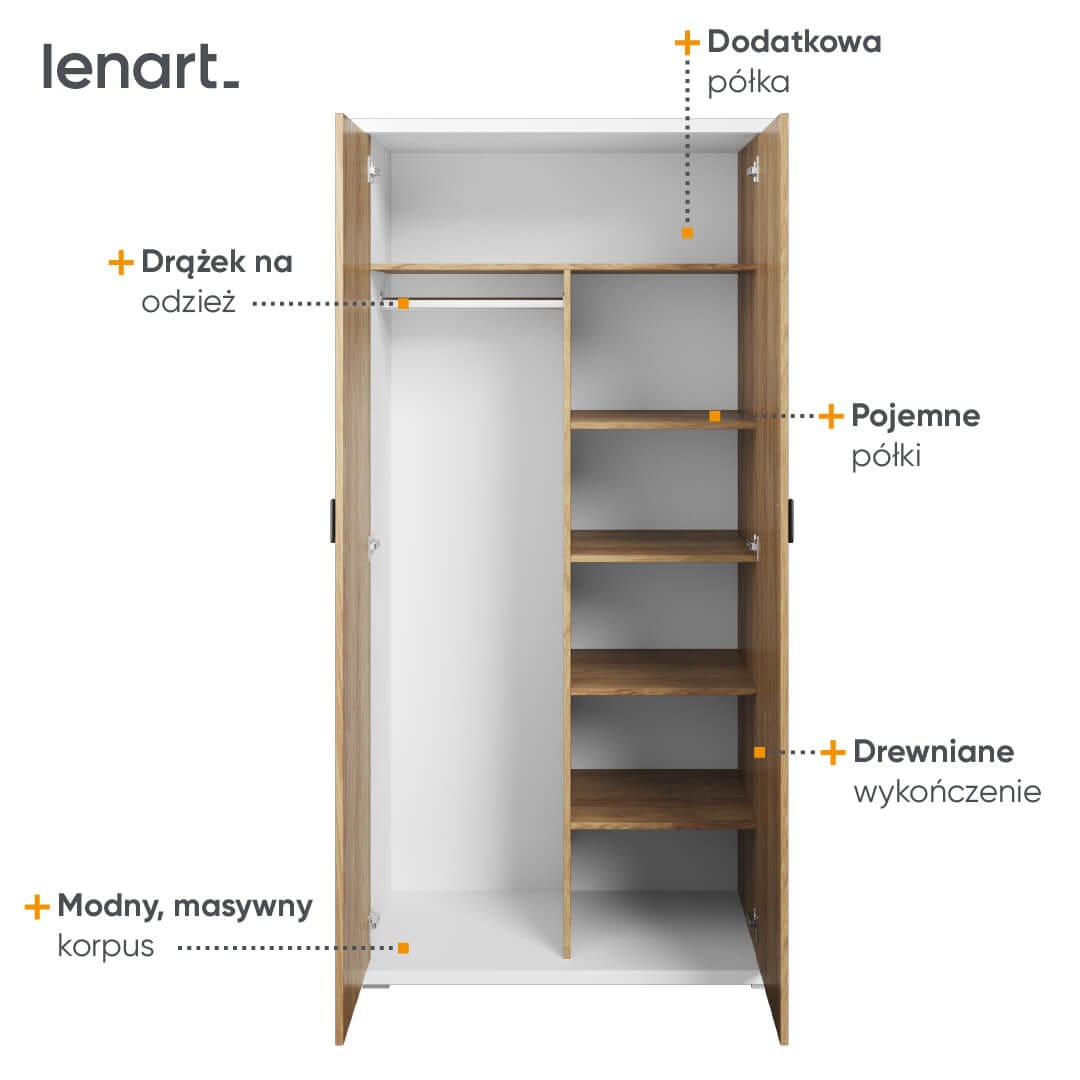 Pojemna szafa dwudrzwiowa z funkcjonalnym wnętrzem. Układ szafy przedzielono na pół, tworząc miejsce na wewnętrzny regał z półkami oraz drążek na odzież, na którym swobodnie zawiesisz ubrania o różnej długości. Dodatkowe miejsce do przechowywania znajduje się na wysokiej półce nad drążkiem oraz na dnie szafy.