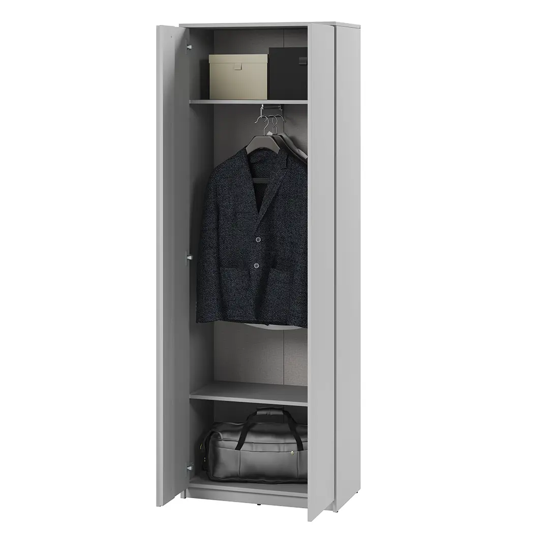 Dzięki takim proporcjom, szafa doskonale sprawdzi się nawet w wąskich korytarzach, nie zajmując przy tym zbyt wiele miejsca. Wnętrze szafy wyposażone jest w drążek na wieszaki oraz półki, co umożliwia wygodne przechowywanie odzieży wierzchniej, butów czy akcesoriów.