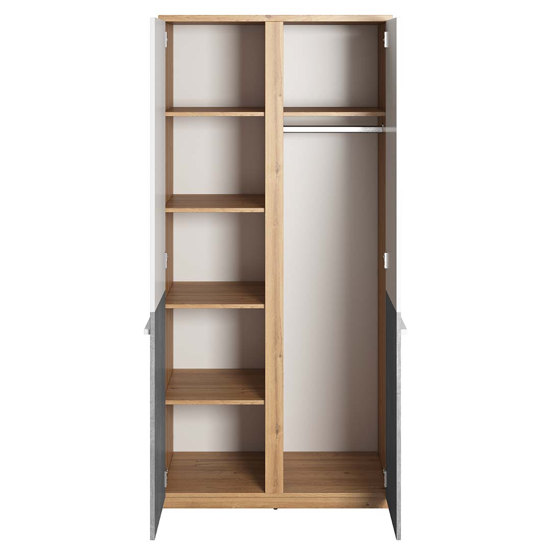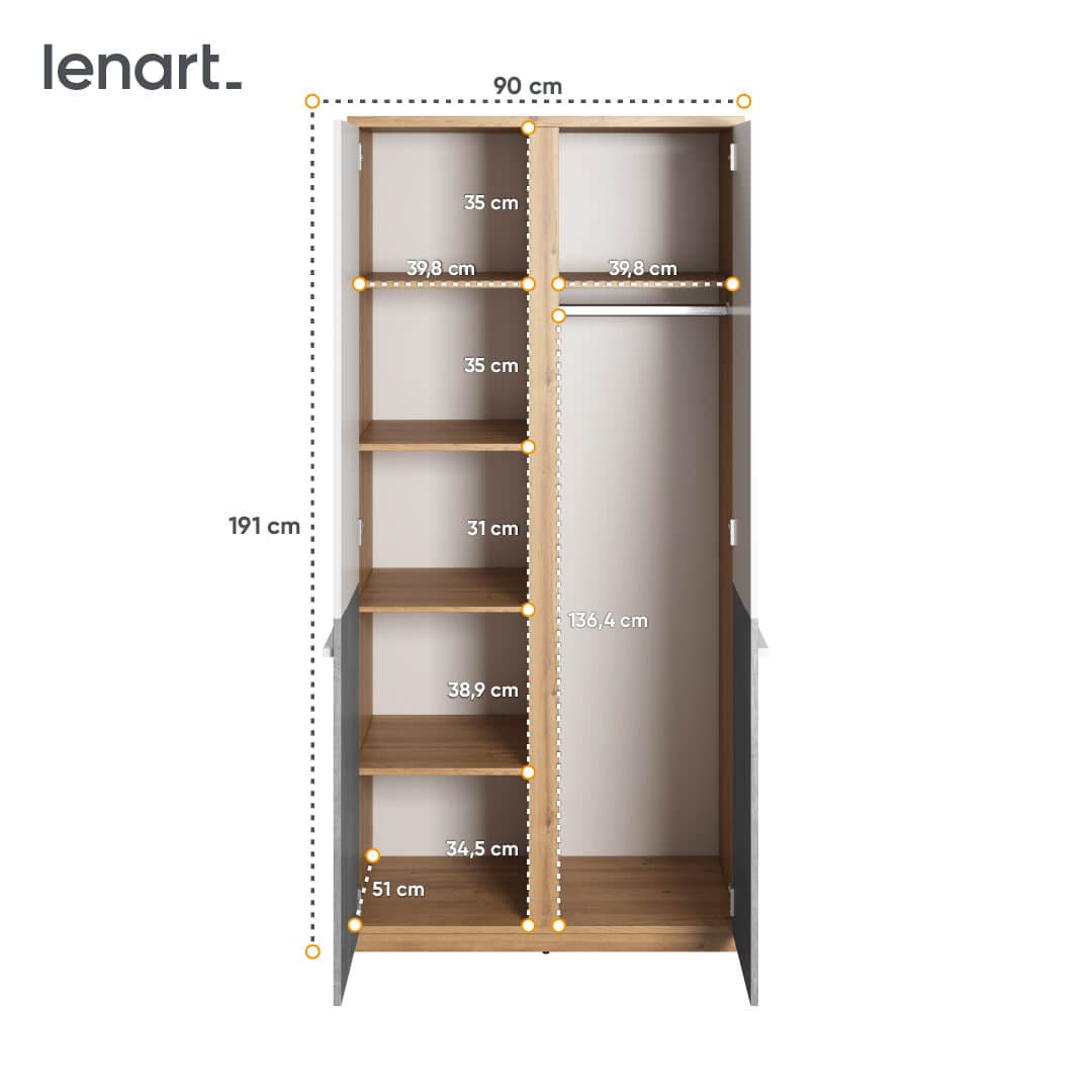 Dwudrzwiowa szafa z drążkiem to znakomite rozwiązanie dla wszystkich, którzy lubią gdy ubrania swobodnie wiszą na wieszakach. Dno szafy możesz z powodzeniem wykorzystać do przechowywania pudełek z butami, walizek lub mniejszych sprzętów sportowych.