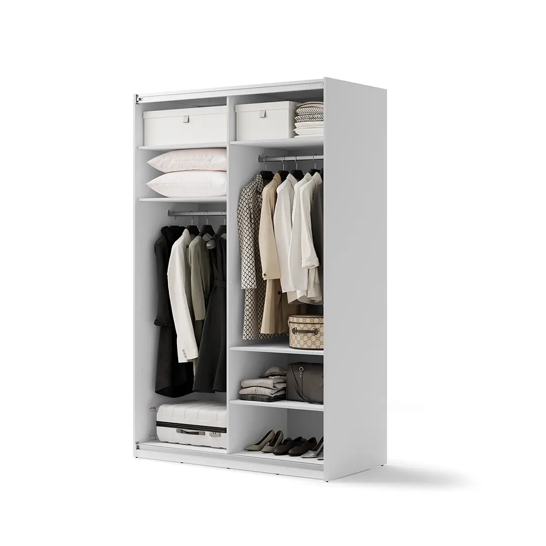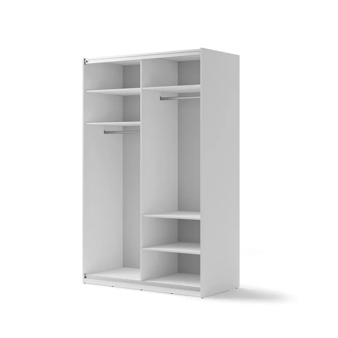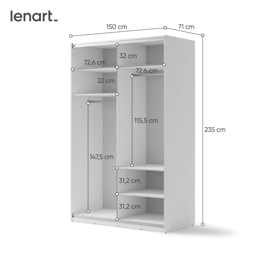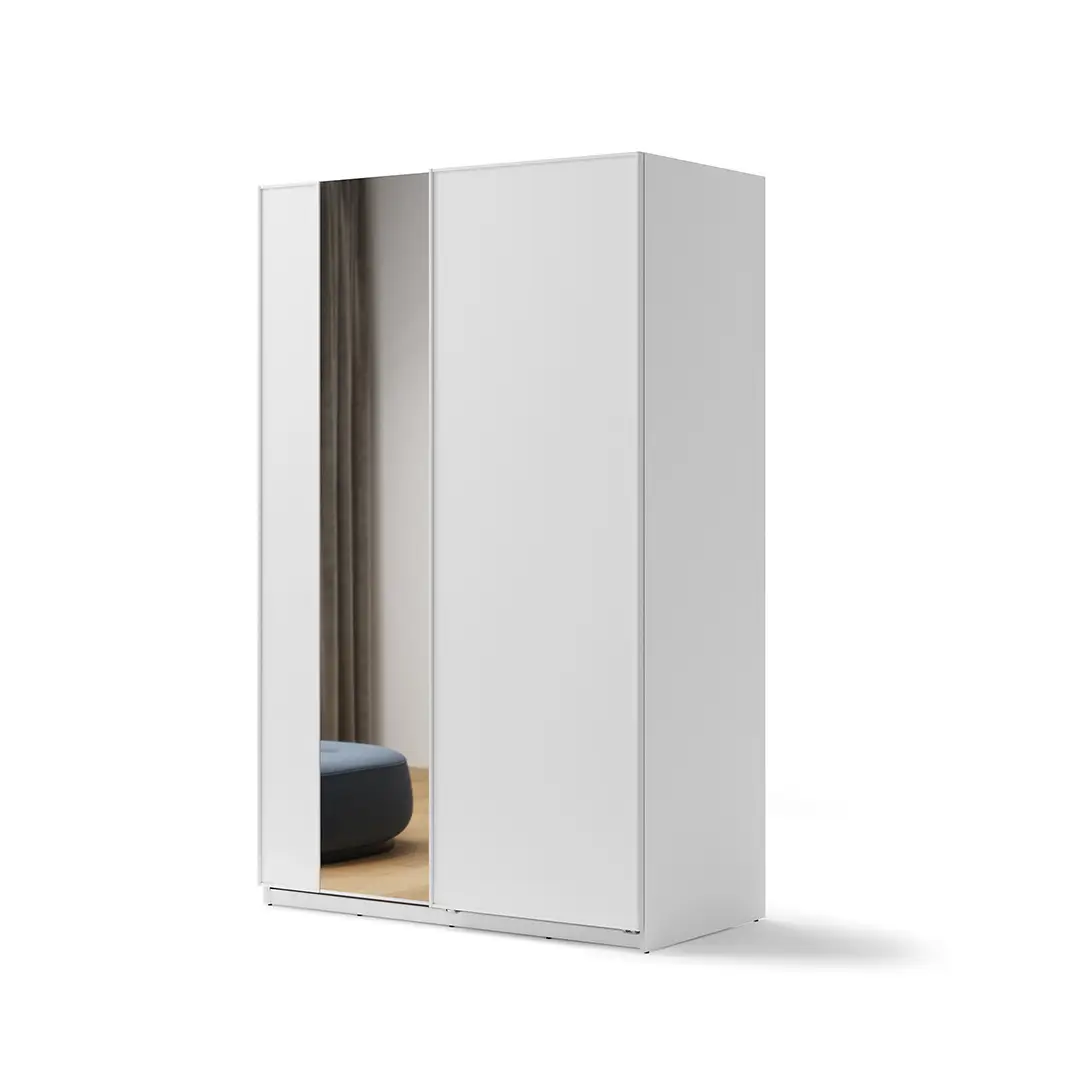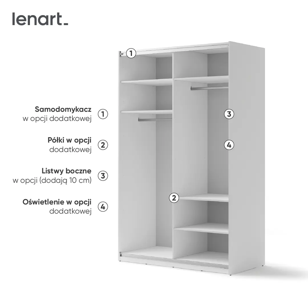 Zainwestuj w elegancję i funkcjonalność z naszą białą szafą przesuwną z lustrem o szerokości 150 cm. Wśród elementów dodatkowych, o które możesz doposażyć szafę znajdziesz: samodomykacz do drzwi przesuwnych, półki dzięki którym z łatwością dostosujesz wnętrze szafy do swoich potrzeb, a także w opaskę z oświetleniem, która z zależności od wolnego miejsca do zagospodarowania pozwoli Ci dopasować szerokość szafy.