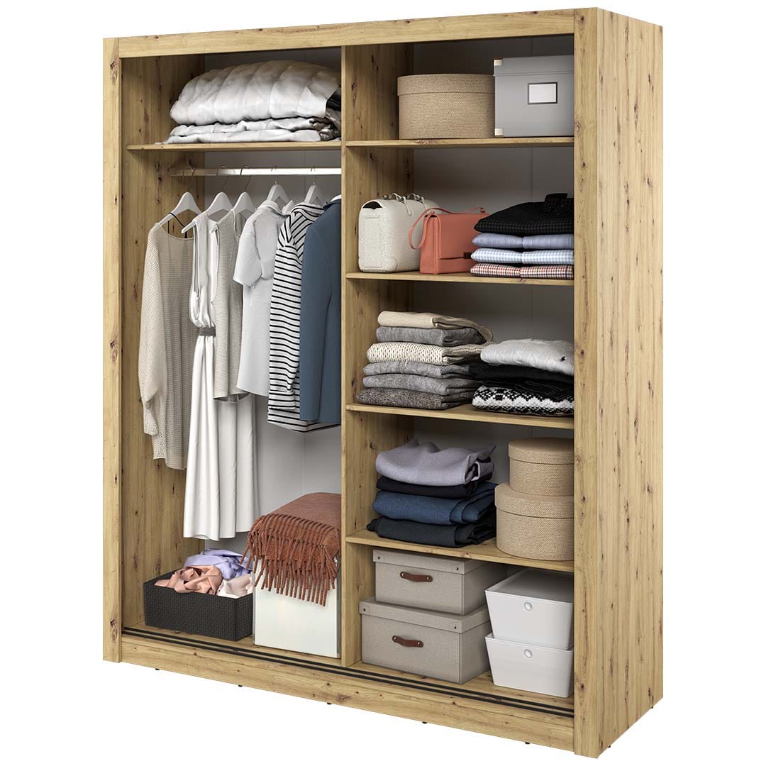 Oświetlenie do szafy w opcji dodatkowej. Mebel wykonano z wytrzymałej płyty laminowanej wykończonej trwałym obrzeżem ABS.