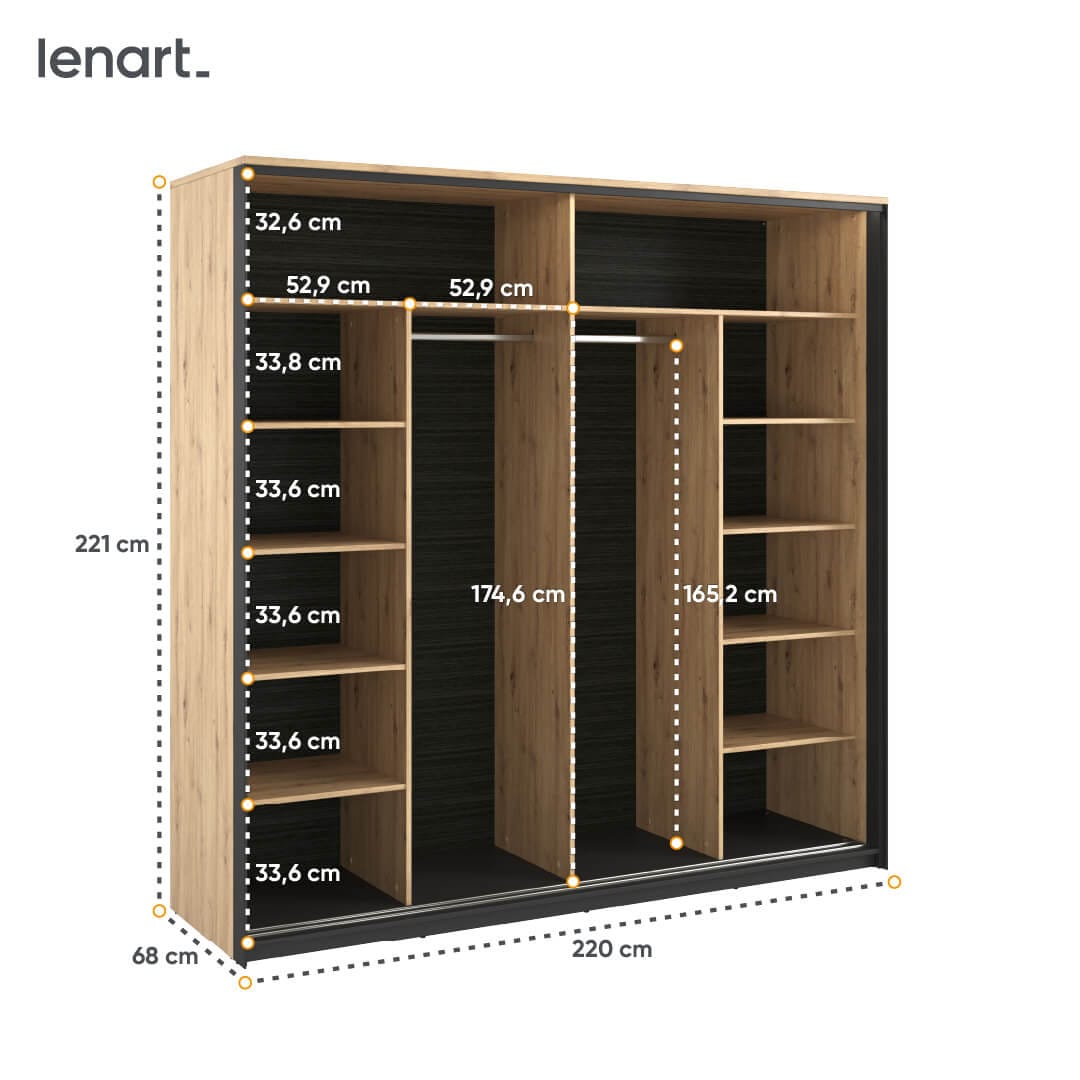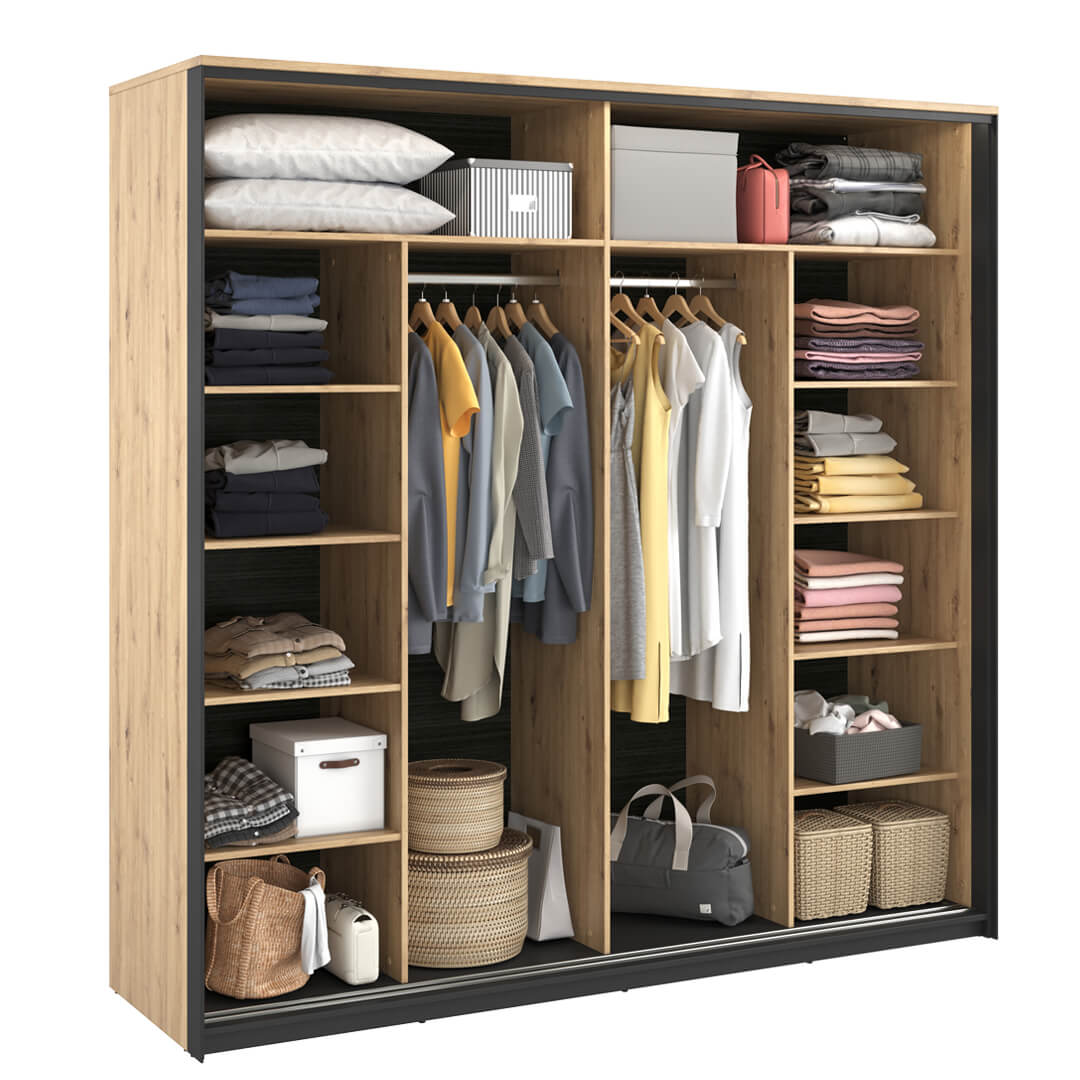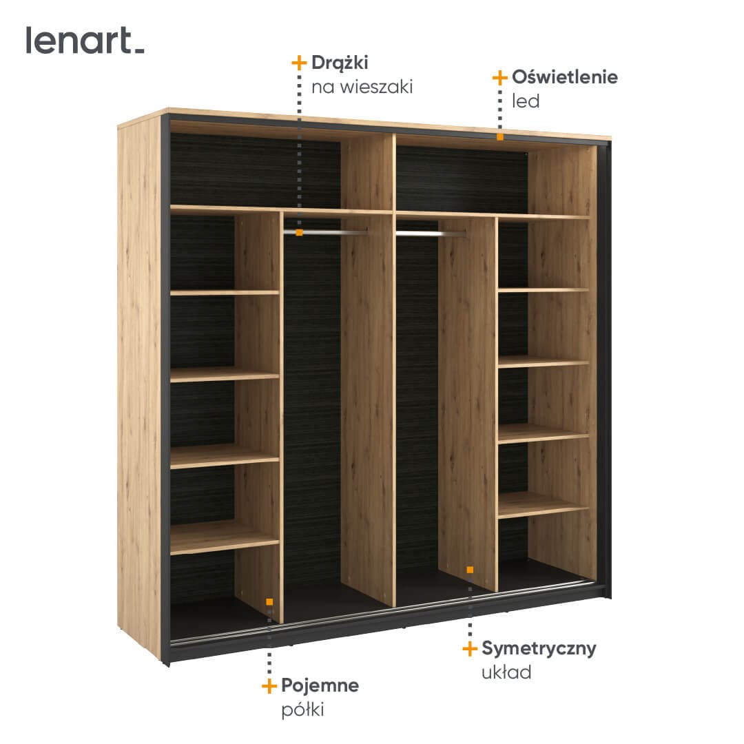 Niezwykle pojemna i funkcjonalna szafa z dwojgiem drzwi przesuwnych do sypialni w stylu loftowym. Jej industrialny charakter podkreśla połączenie dekoru w kolorze drewna z czarną ramą, która pełni rolę podpory. Dzięki umieszczeniu dużego lustra na jednym z frontów optycznie powiększa pomieszczenie i czyni je bardziej przestronnym.
