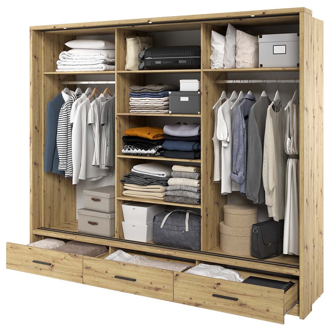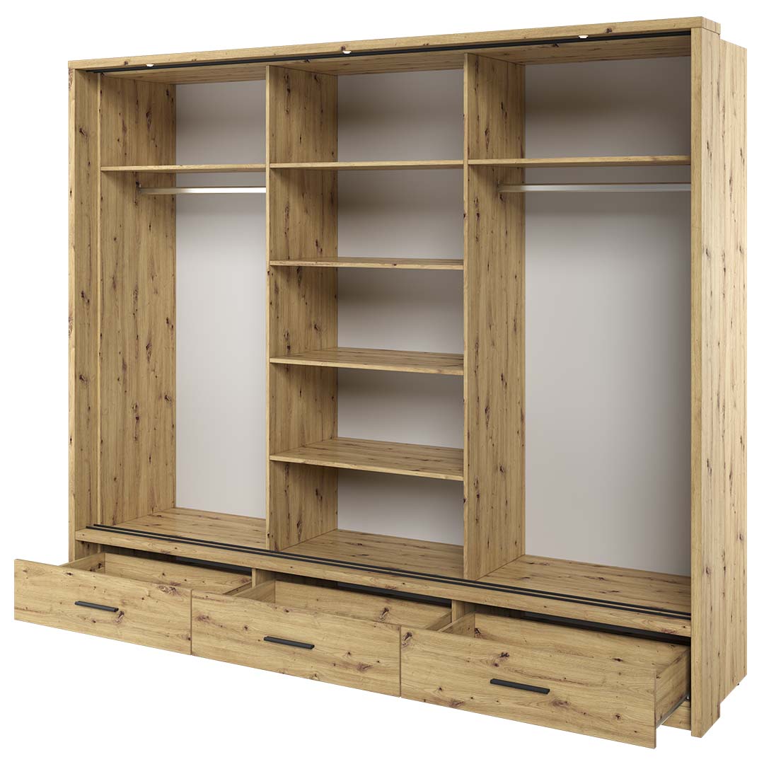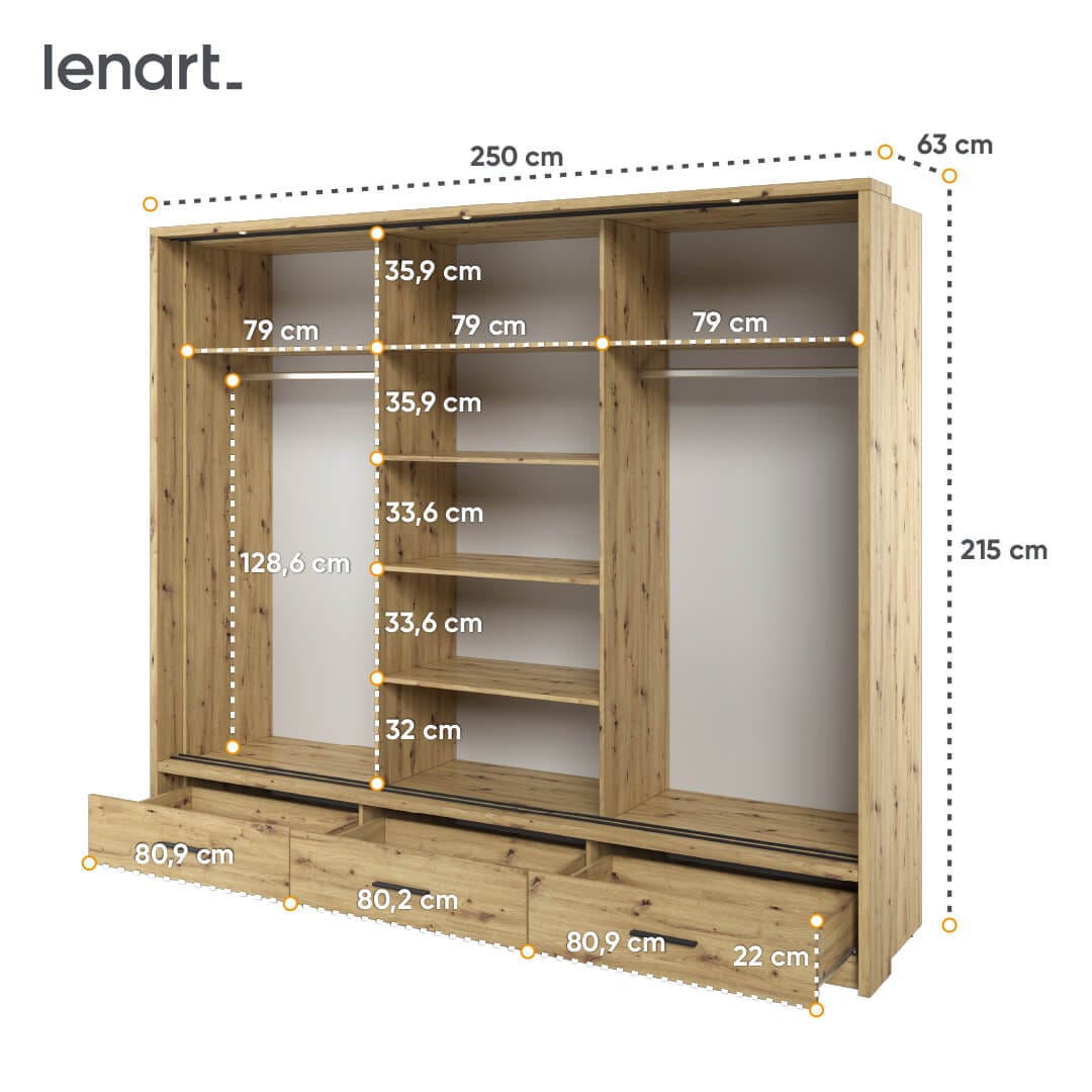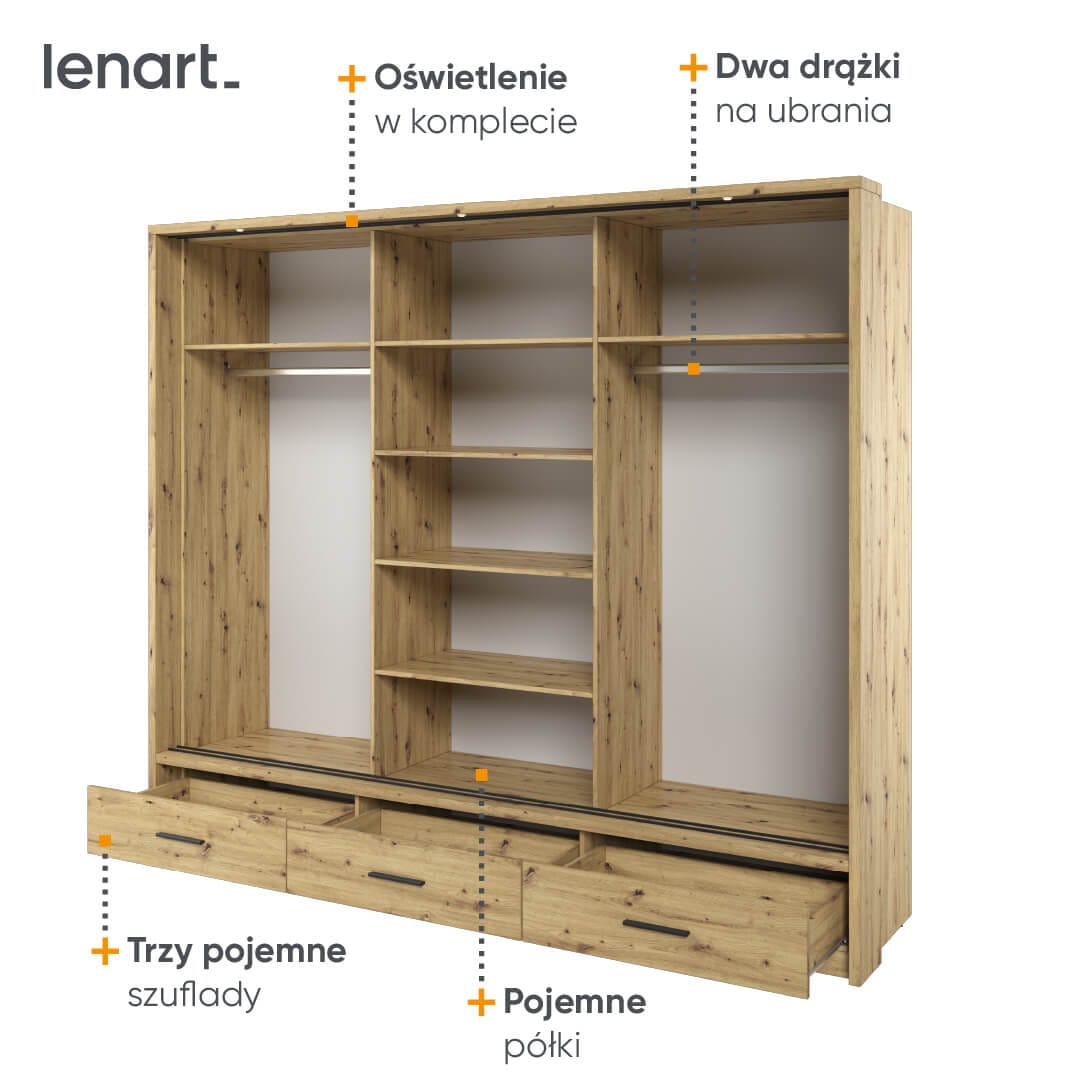 Szafa trzydrzwiowa z lustrem to idealne rozwiązanie dla osób ceniących sobie porządek i elegancję. Jej duże lustro nie tylko optycznie powiększa przestrzeń, ale także sprawia, że przygotowywanie się do wyjścia staje się prawdziwą przyjemnością. Teraz możesz łatwo sprawdzić swoją stylizację z każdego kąta! Trzydrzwiowa szafa przesuwna sprawia, że zyskujesz łatwy dostęp do jej wnętrza. Została również wyposażona w trzy pojemne szuflady, co ułatwia przechowywanie mniejszych przedmiotów, takich jak bielizna czy dodatki.