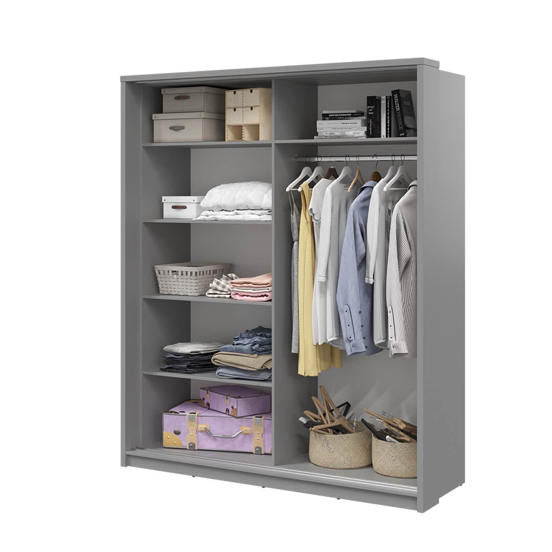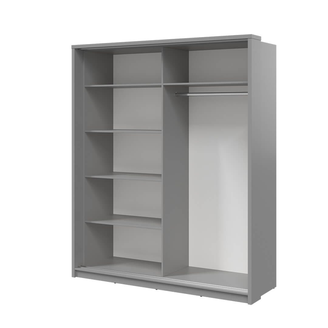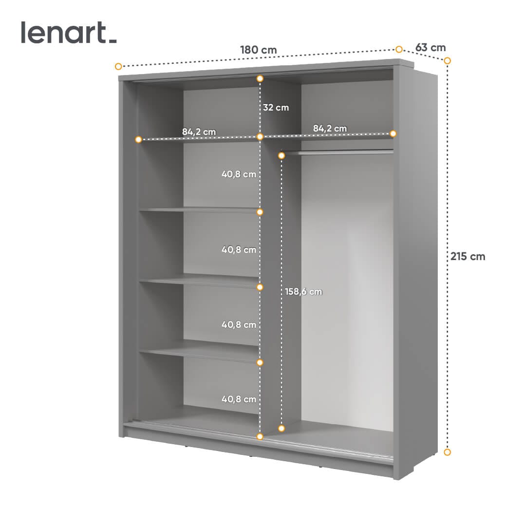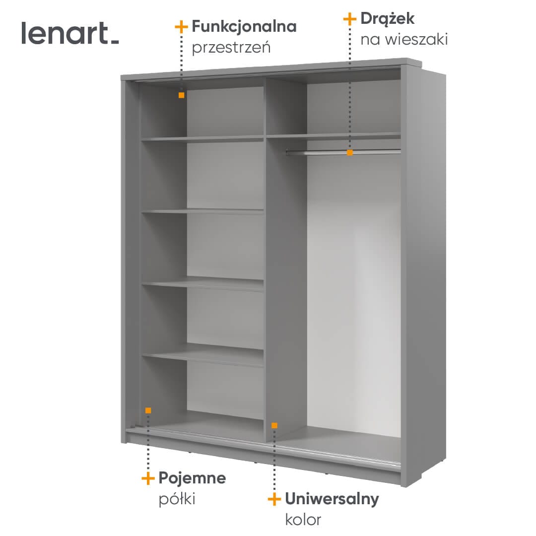 Szafa z lustrem 180 cm doskonale sprawdzi się zarówno w sypialni, przedpokoju, jak i salonie. Została zaprojektowana w dwóch kolorach, dzięki czemu z łatwością można dopasować ją do wystroju wnętrza. Szafa została wyposażona w funkcjonalny układ pojemnych półek oraz drążek na wieszaki, na którym przechowasz odzież o różnej długości. Drzwi przesuwne nie tylko ułatwiają dostęp do rzeczy, ale przede wszystkim oszczędzają przestrzeń. Ciekawym akcentem jest niesymetryczne, designerskie lustro, w którym przejrzysz się podczas kompletowania stylizacji lub układania włosów.
