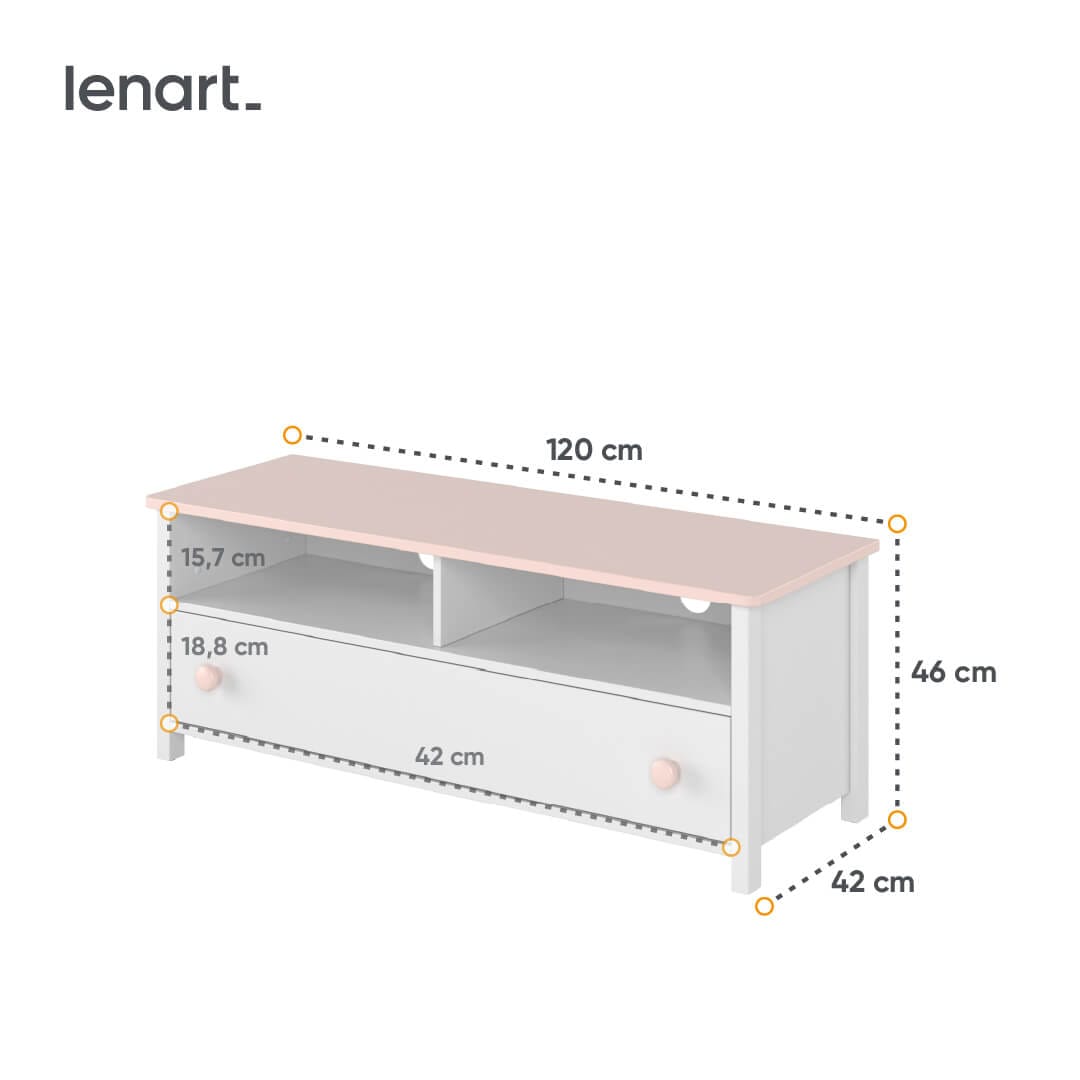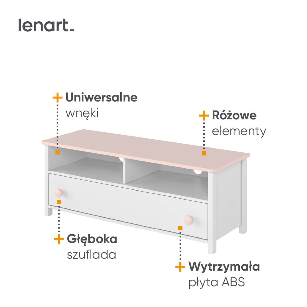 Mebel wyróżnia się oryginalnym charakterem. Bryła w kolorze ej bieli oraz blat i dodatki w kolorze pudrowego różu tworzą niepowtarzalny styl, który spodoba się wielbicielkom bajek o księżniczkach.