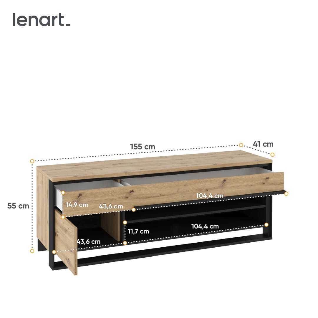 Funkcjonalne wnętrze z dwiema wnękami, pojemną szufladą i szafką z drzwiami sprzyja utrzymaniu porządku w całej strefie RTV.