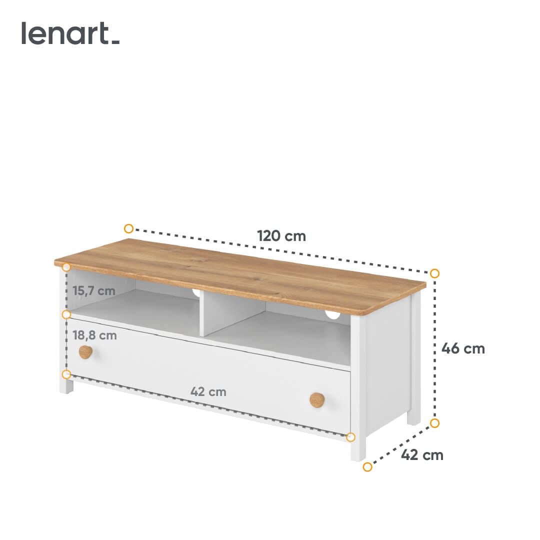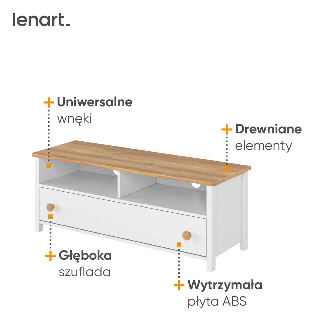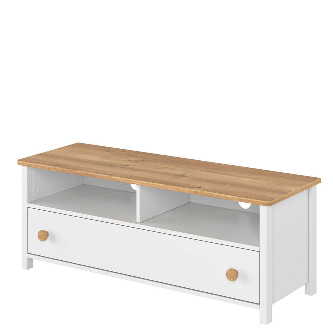 Funkcjonalna szafka RTV z dwiema uniwersalnymi wnękami na sprzęty elektroniczne i pojemną, głęboką szufladą.