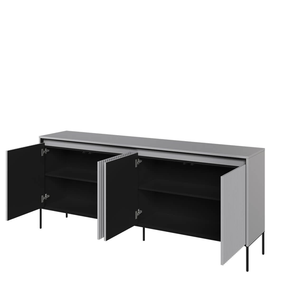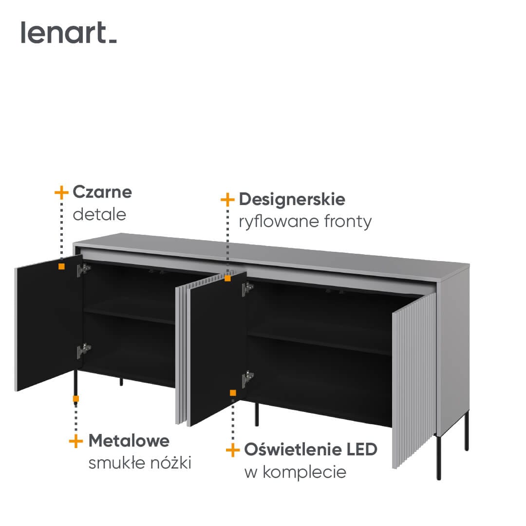 Wybierając naszą szarą komodę, inwestujesz w funkcjonalny i estetyczny mebel, który doda stylu i organizacji Twojemu salonowi. Jej neutralny kolor i ryflowane fronty sprawiają, że będzie pasować do wielu różnych stylów aranżacji. Nie czekaj dłużej i dodaj naszą szarą komodę do swojego salonu. Ożyw przestrzeń, uporządkuj przedmioty i ciesz się estetycznym i praktycznym meblem.