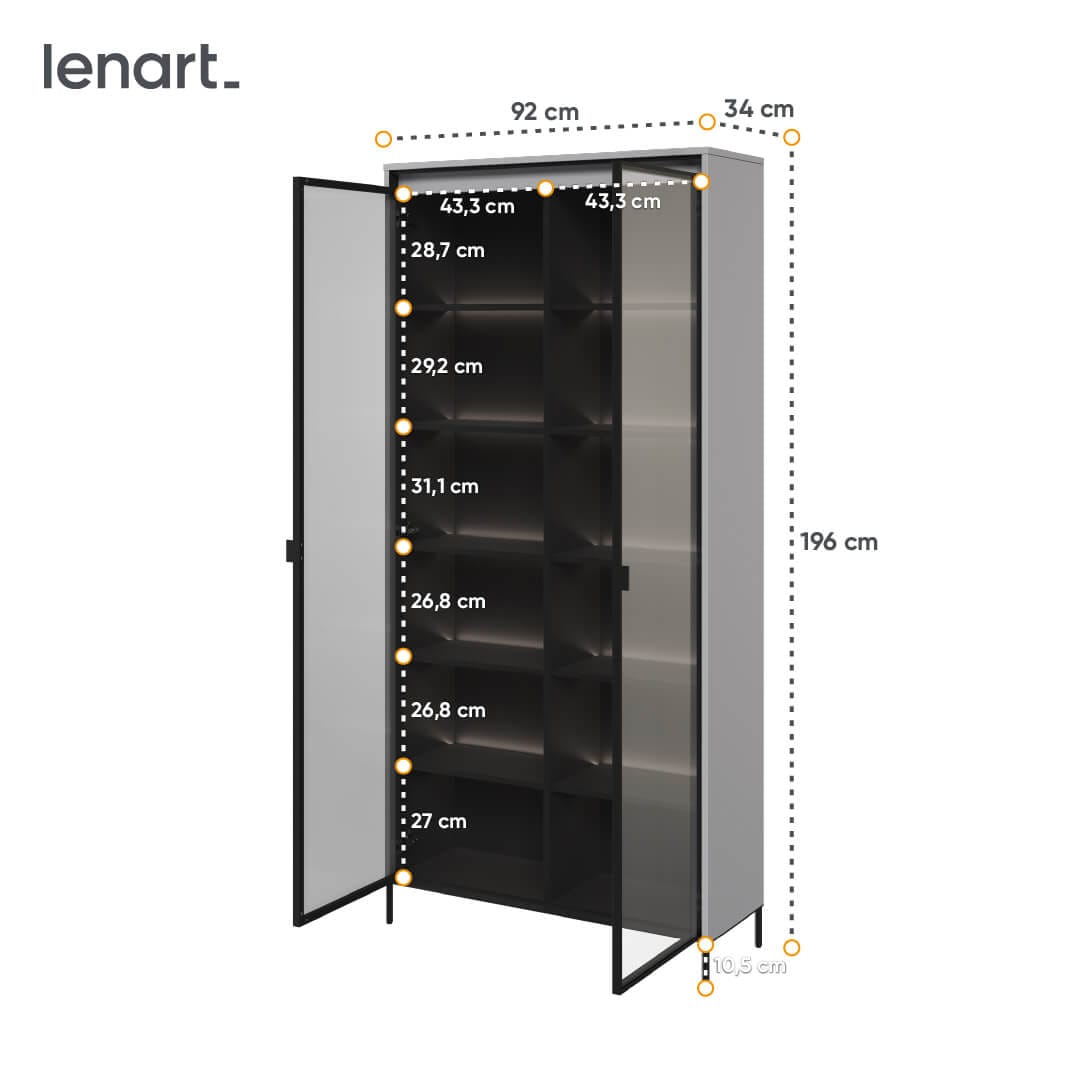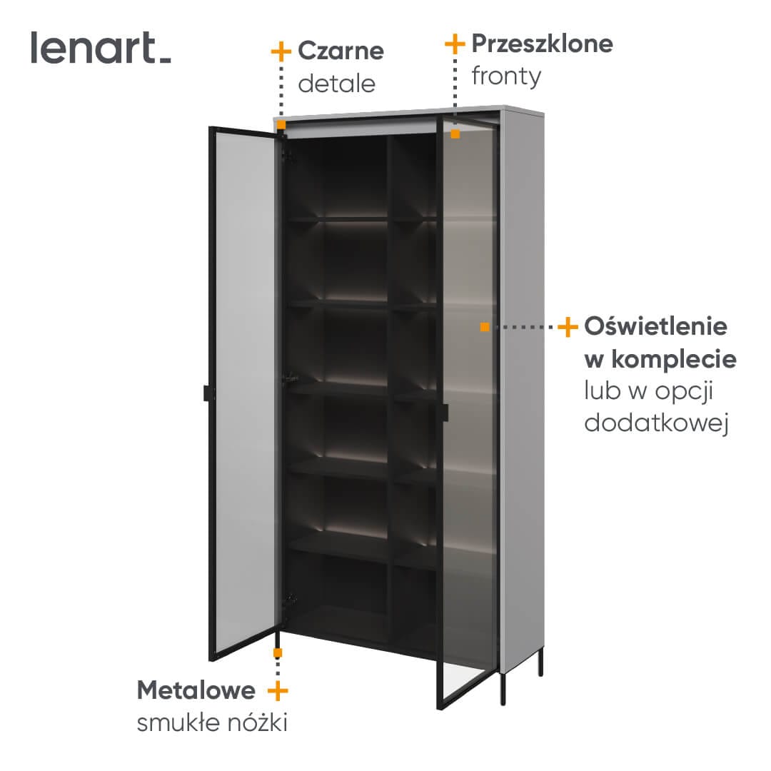 Witryna to mebel, który nie tylko pełni praktyczną funkcję, ale także stanowi efektowną dekorację wnętrza. Nasza szklana witryna jest niezwykle elegancka i pasuje do różnych stylów aranżacji salonu. Jej minimalistyczny design i kolor sprawiają, że idealnie wkomponuje się w nowoczesne, skandynawskie czy industrialne wnętrza. Szklane drzwi witryny dają wrażenie lekkości i przestrzenności. Ponadto szklana witryna do salonu TR-07 jest podświetlana, co dodatkowo podkreśla jej estetykę i umożliwia piękne eksponowanie ulubionych przedmiotów i dekoracji.