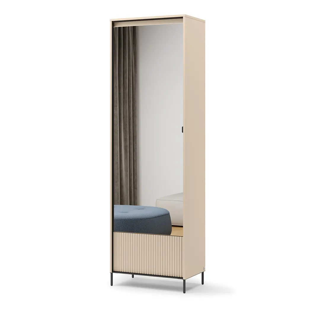 Wąska szafa została zaprojektowana z myślą o maksymalnym wykorzystaniu dostępnej przestrzeni. Ich kompaktowe wymiary pozwalają na umieszczenie mebla nawet w wąskich korytarzach czy niewielkich wnękach, nie zaburzając przy tym ergonomii pomieszczenia. Wnętrze szafy może być wyposażone w półki, drążki na wieszaki oraz szuflady, co umożliwia uporządkowane przechowywanie ubrań, butów i dodatków. Szaf na ubrania wyposażona jest w praktyczne dodatki, takie jak lustra na frontach drzwi, które optycznie powiększają przestrzeń i ułatwiają codzienne przygotowania.