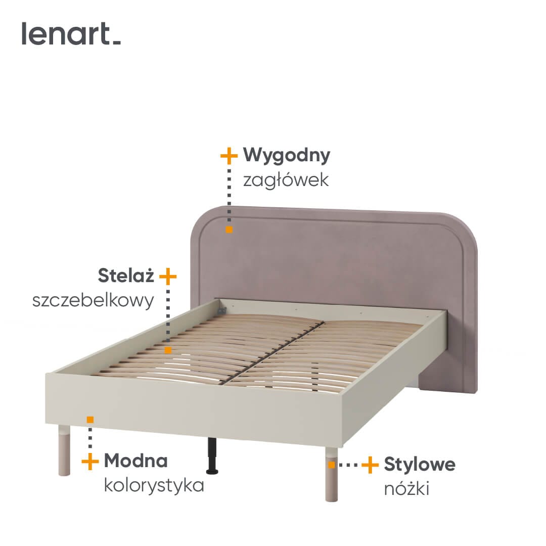 Wygodne łóżko do spania HR-09 to idealne rozwiązanie, które zapewni Twojemu dziecku komfortowy i relaksujący sen każdej nocy. Stabilna konstrukcja i stelaż szczebelkowy gwarantują odpowiednie podparcie dla ciała, co przekłada się na zdrowy sen i prawidłowe ułożenie kręgosłupa. Mebel wspiera się na smukłych nóżkach dzięki czemu wygląda niezwykle lekko i subtelnie. Połączenie kolorów takich jak kaszmir oraz truflowy sprawiają, że mebel ten jest nie tylko ponadczasowy, ale także świetnie pasuje do pokoi dziewczynek w różnym wieku. Wyposażony w miękki, tapicerowany zagłówek gwarantuje wygodne oparcie podczas wieczornego seansu filmowego.