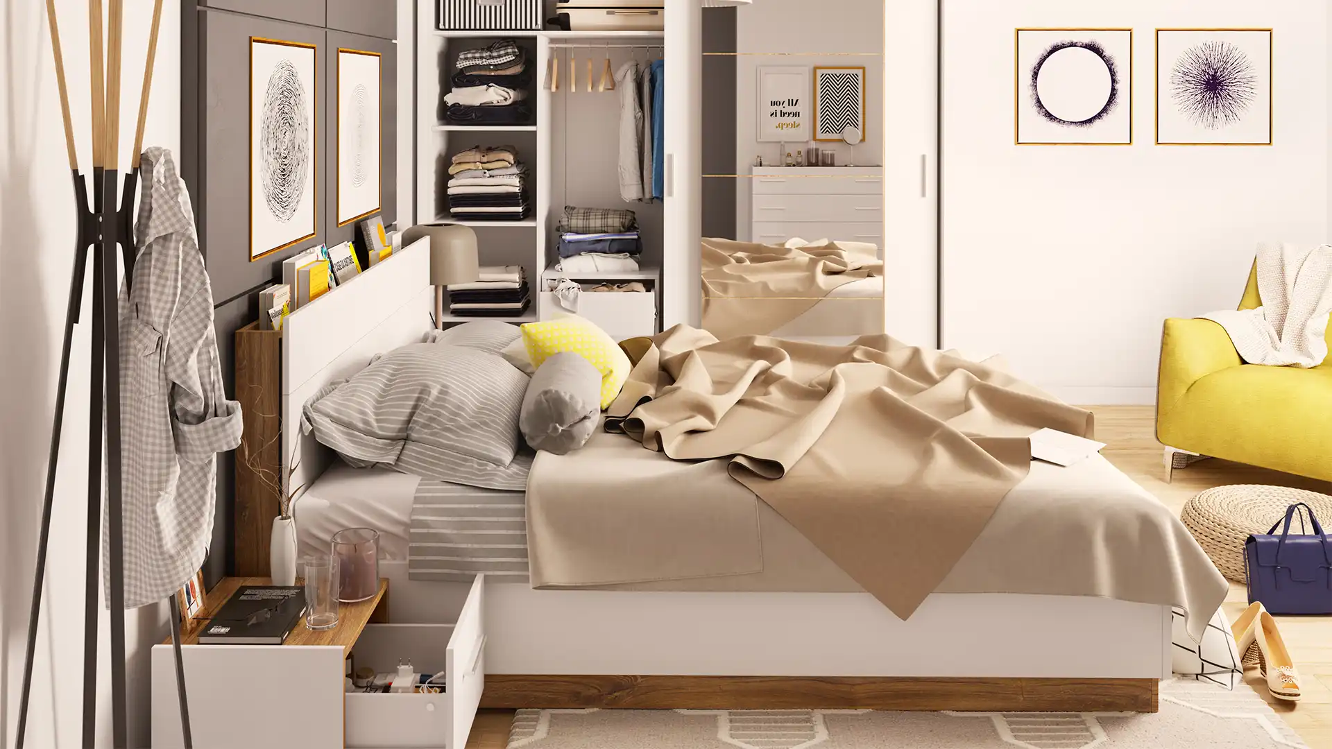 Mała sypialnia z szafą i biurkiem